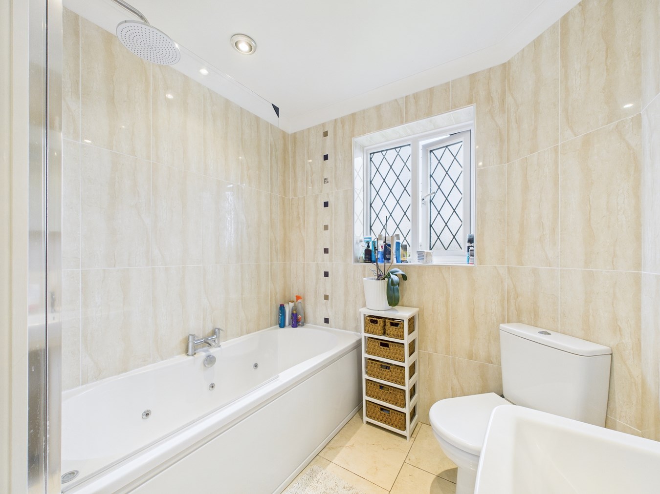 3.06m x 2.13m (10' 0" x 7' 0") The family bathroom features a double glazed frosted window to rear, airing cupboard, low level w.c, panelled bath with glass screen and shower attachment, wash hand basin, chrome ladder style radiator, downlights, tiled walls and flooring.