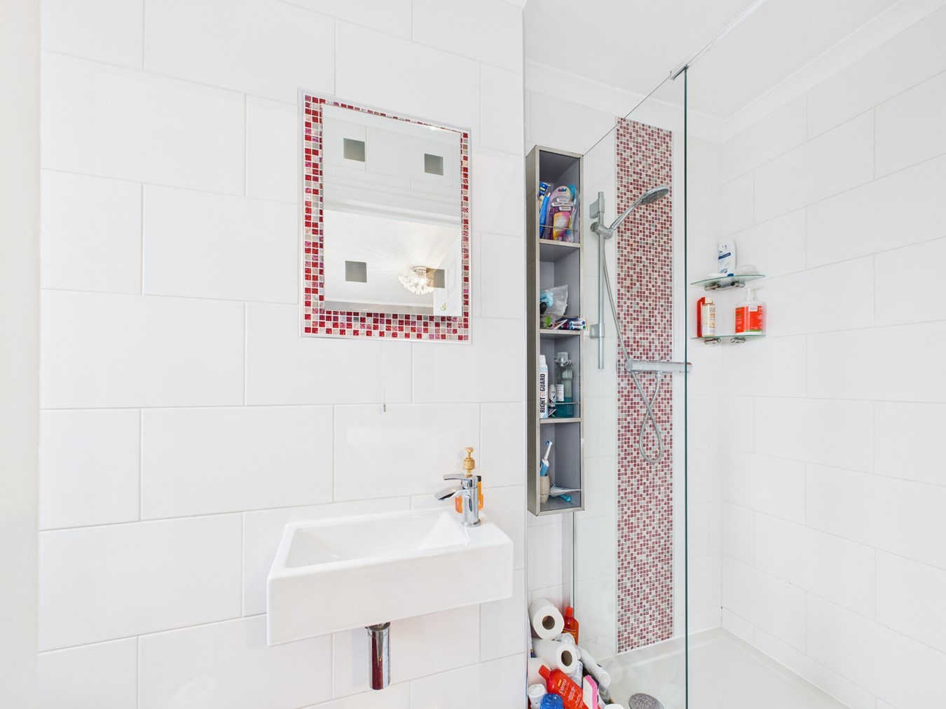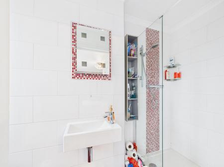 3.07m x 0.82m (10' 1" x 2' 8") Featuring a double glazed frosted window to front, low level w.c, walk-in shower, wash hand basin, chrome ladder style radiator, downlights, tiled walls and flooring.