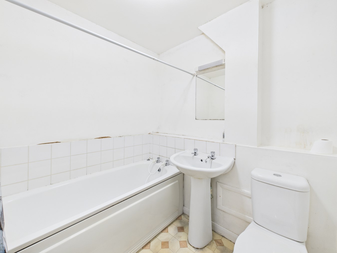 2.04m x 1.69m (6' 8" x 5' 7") The bathroom has a panelled bath, low level w.c, wash hand basin, radiator, partly tiled walls and vinyl flooring.
