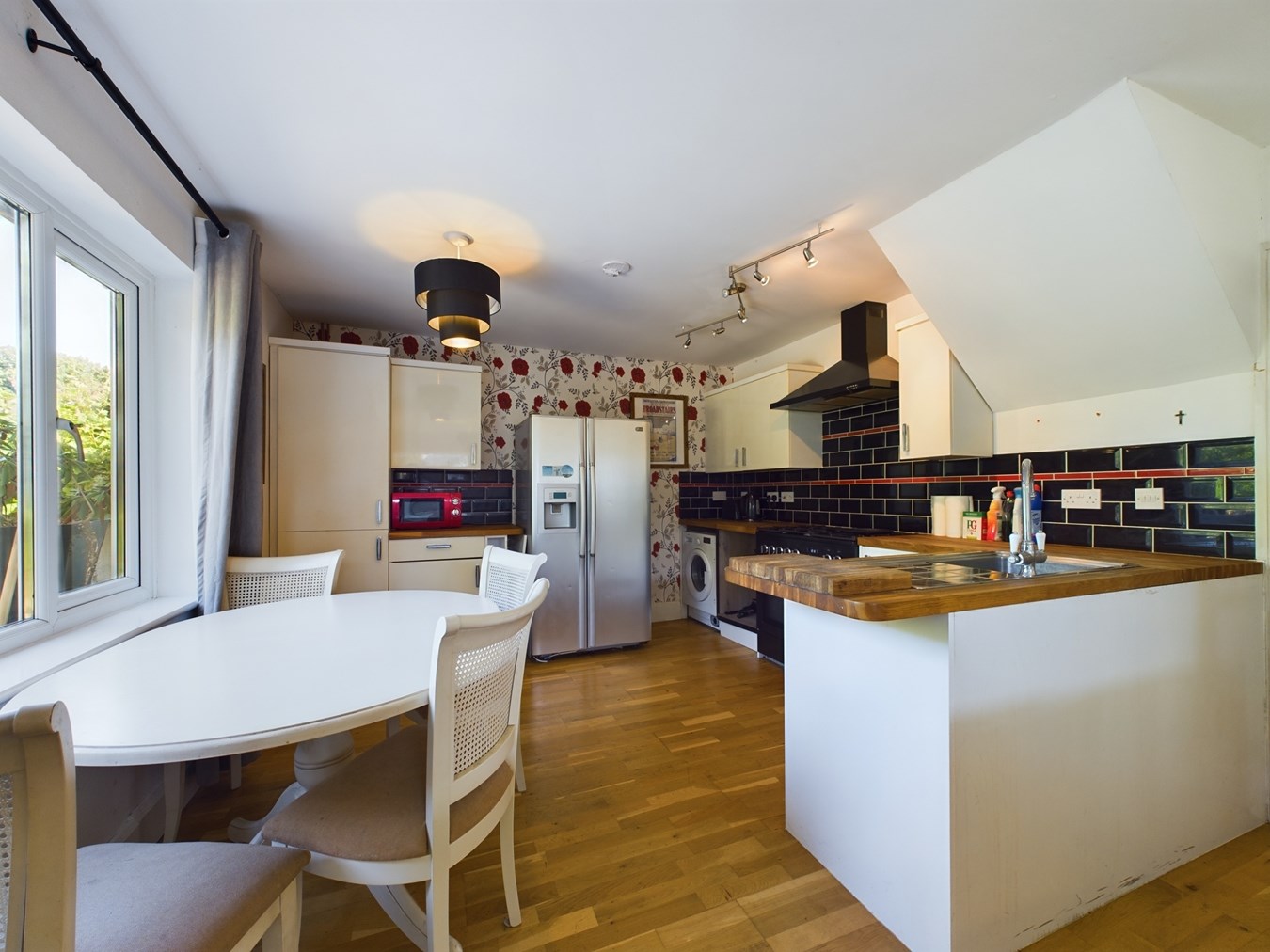 Kitchen Area: Fitted with a range of wall and base units with cream gloss doors. Stainless steel sink unit inset to wood block work surface area. Space for range-style gas cooker with extractor above. Integrated fridge freezer. Space for American style fridge freezer. Integrated dish-washer and washing machine. Local wall tiling. Space for dining table. Inset ceiling lights.