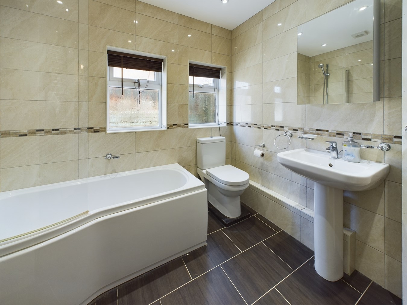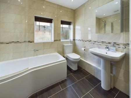 2.54m x 2.37m (8' 4" x 7' 9") Fully tiled to walls and floor. Two double glazed windows to side. Fitted with panelled bath with shower attachment and screen. Pedestal wash hand basin and low level W.C. Built-in cupboard housing gas fired boiler. Ladder style towel rail radiator. Inset ceiling lights.