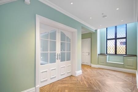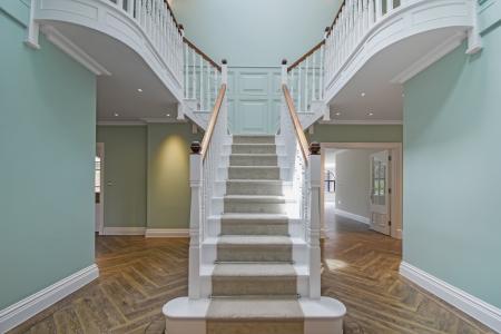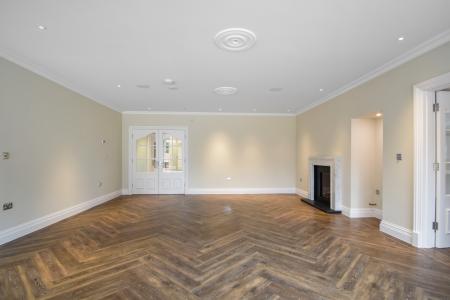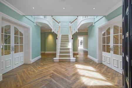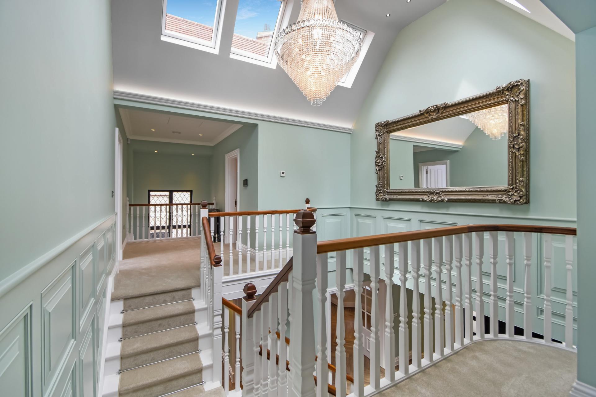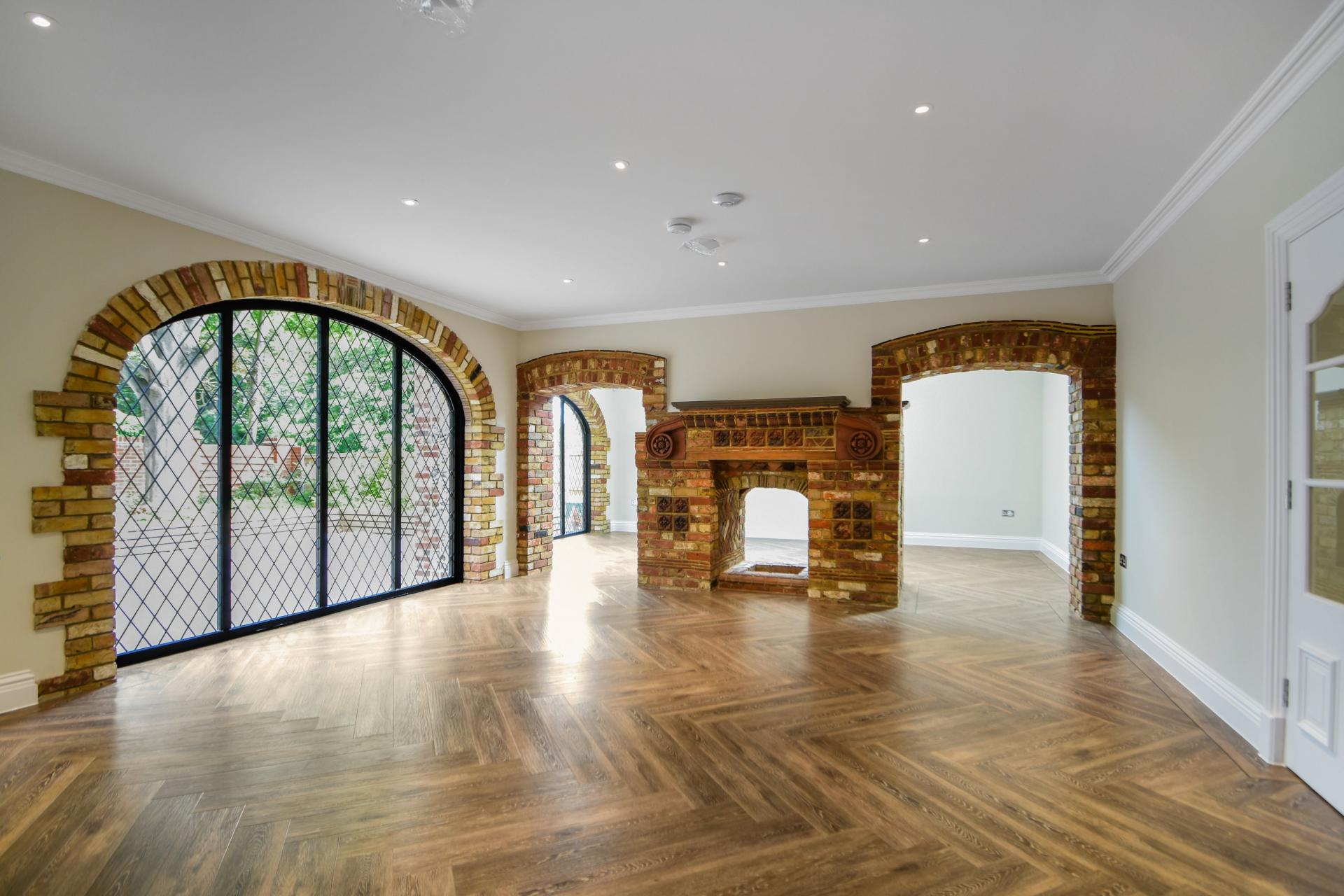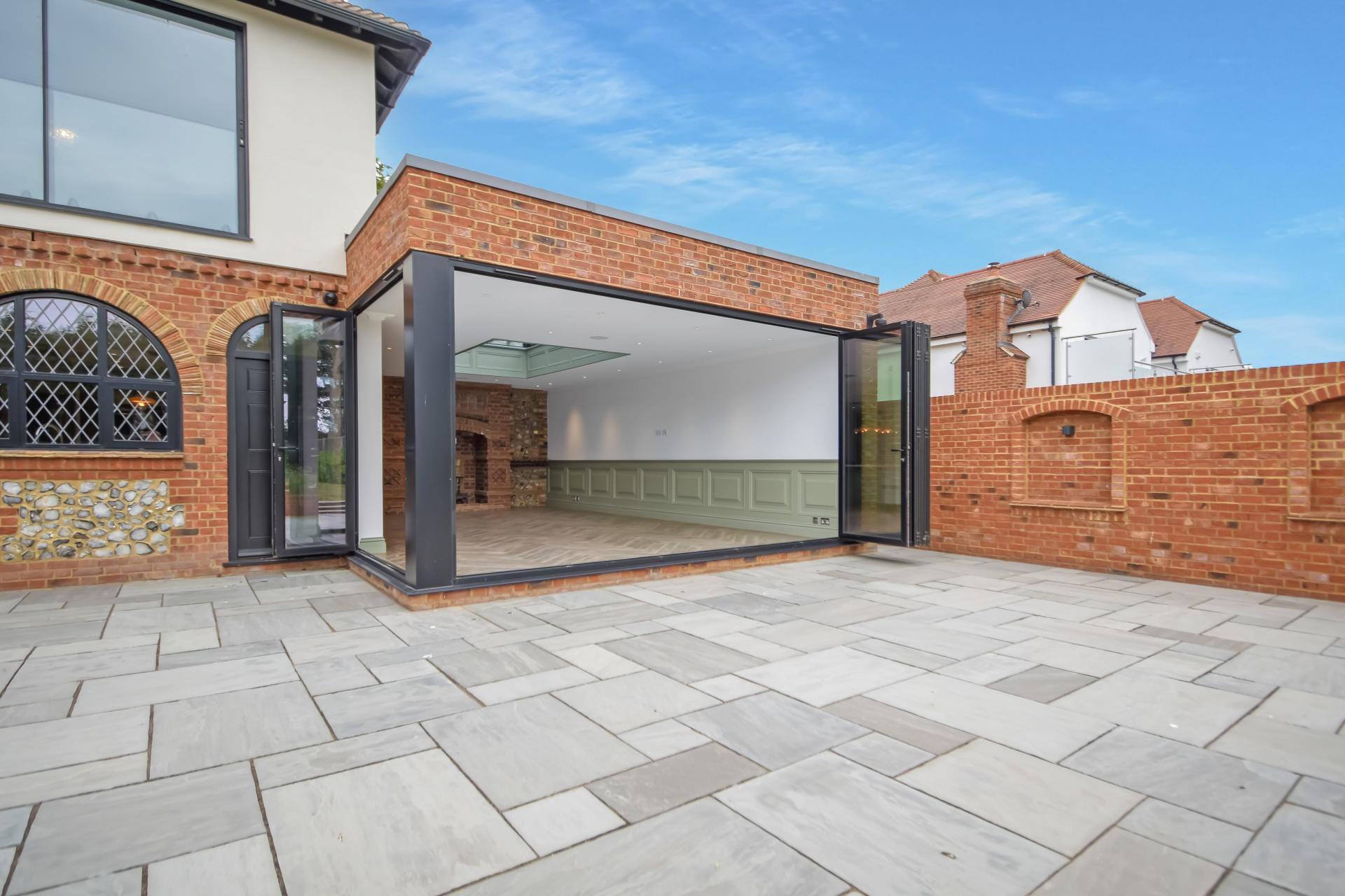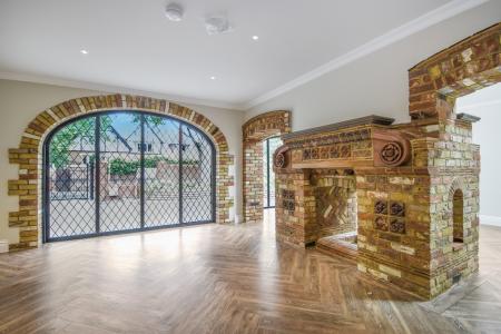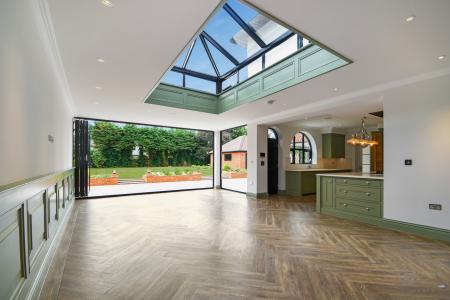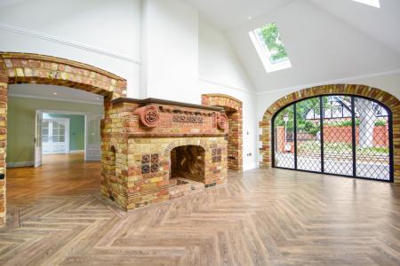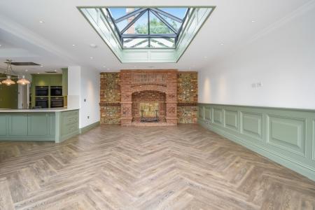 The grand reception hall sets the tone with a bespoke staircase, atrium skylight, and underfloor heating throughout the ground floor. A vast open-plan living space forms the heart of the home, featuring bi-folding doors to a large slate terrace and a south-facing garden, a central fireplace, and skylights that flood the area with natural light.