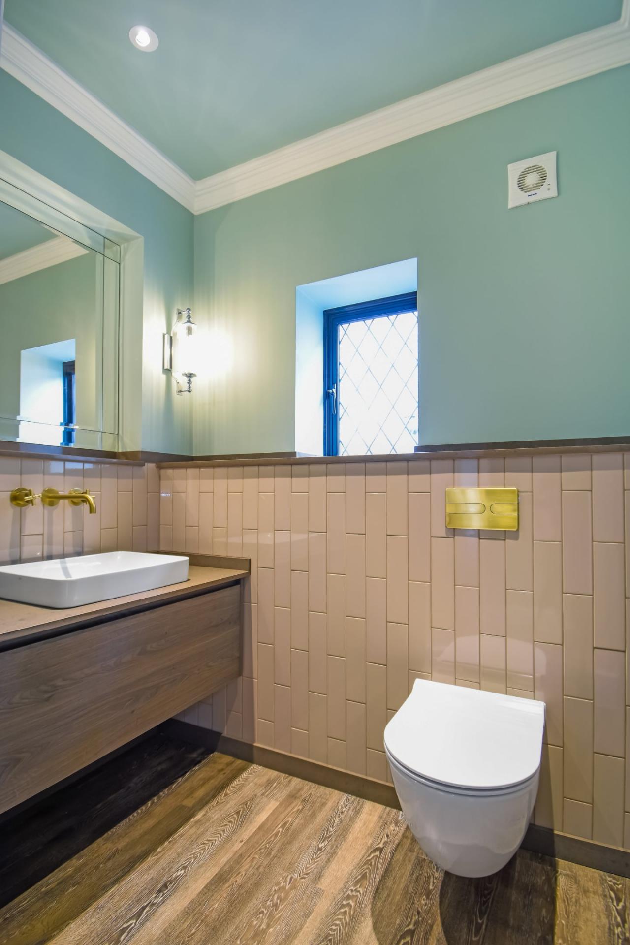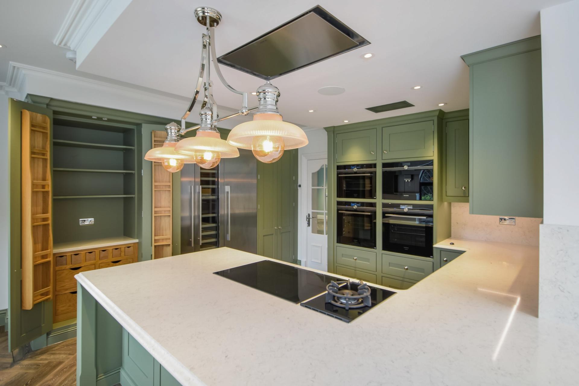 The bespoke Smallbone kitchen includes Siemens Studioline appliances, full-height fridge and freezer, wine cooler, Quooker tap, and an integrated coffee machine. The adjoining dining space seats 20 beneath a dramatic atrium ceiling and exposed flint and brick wall.