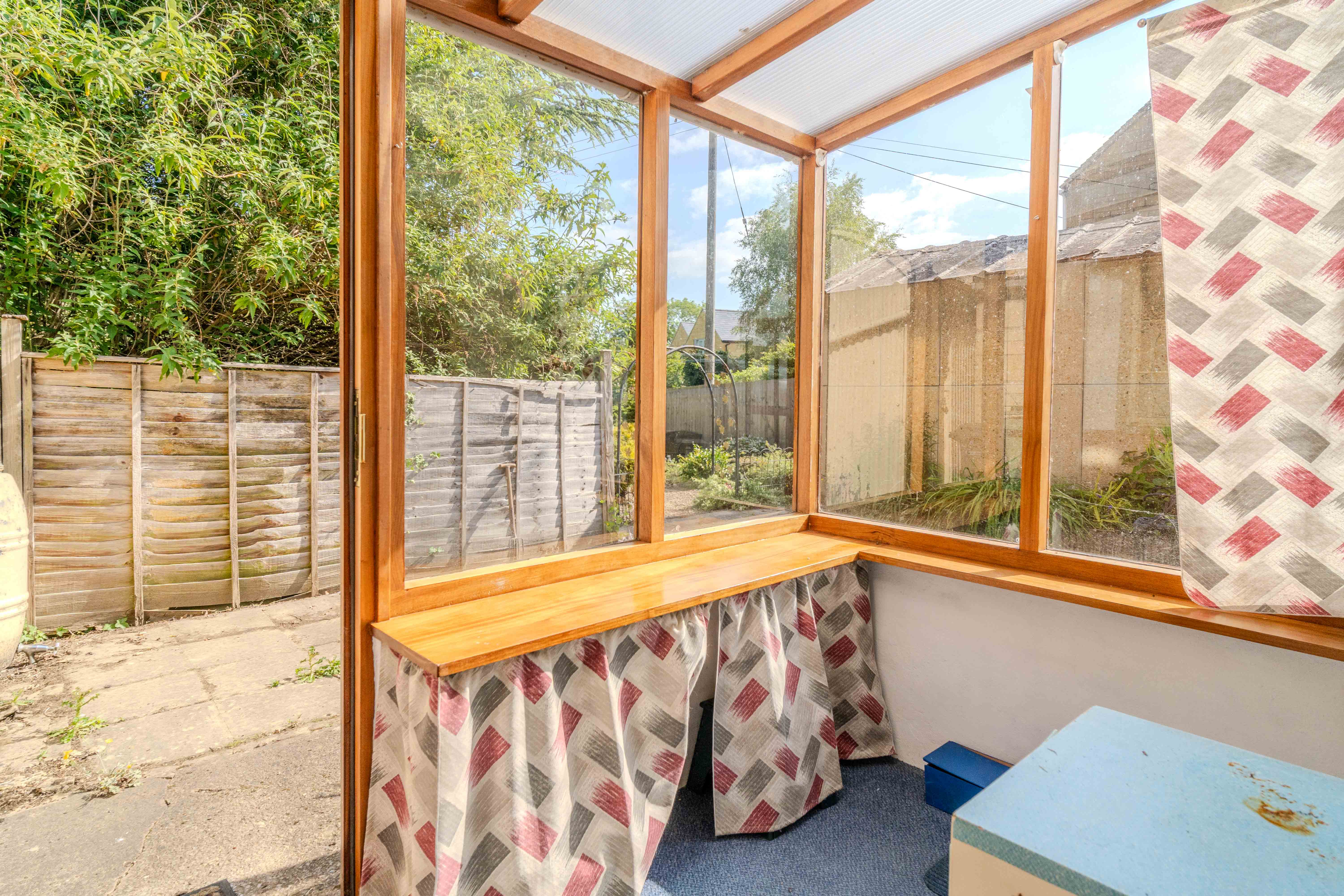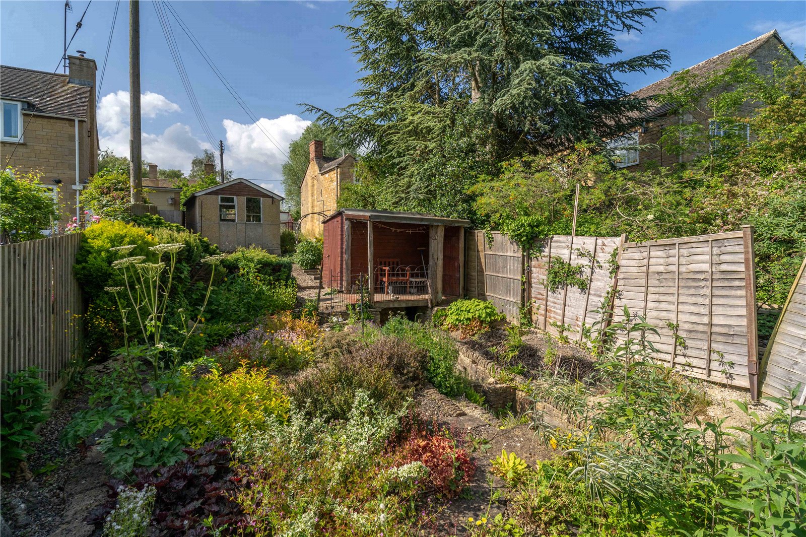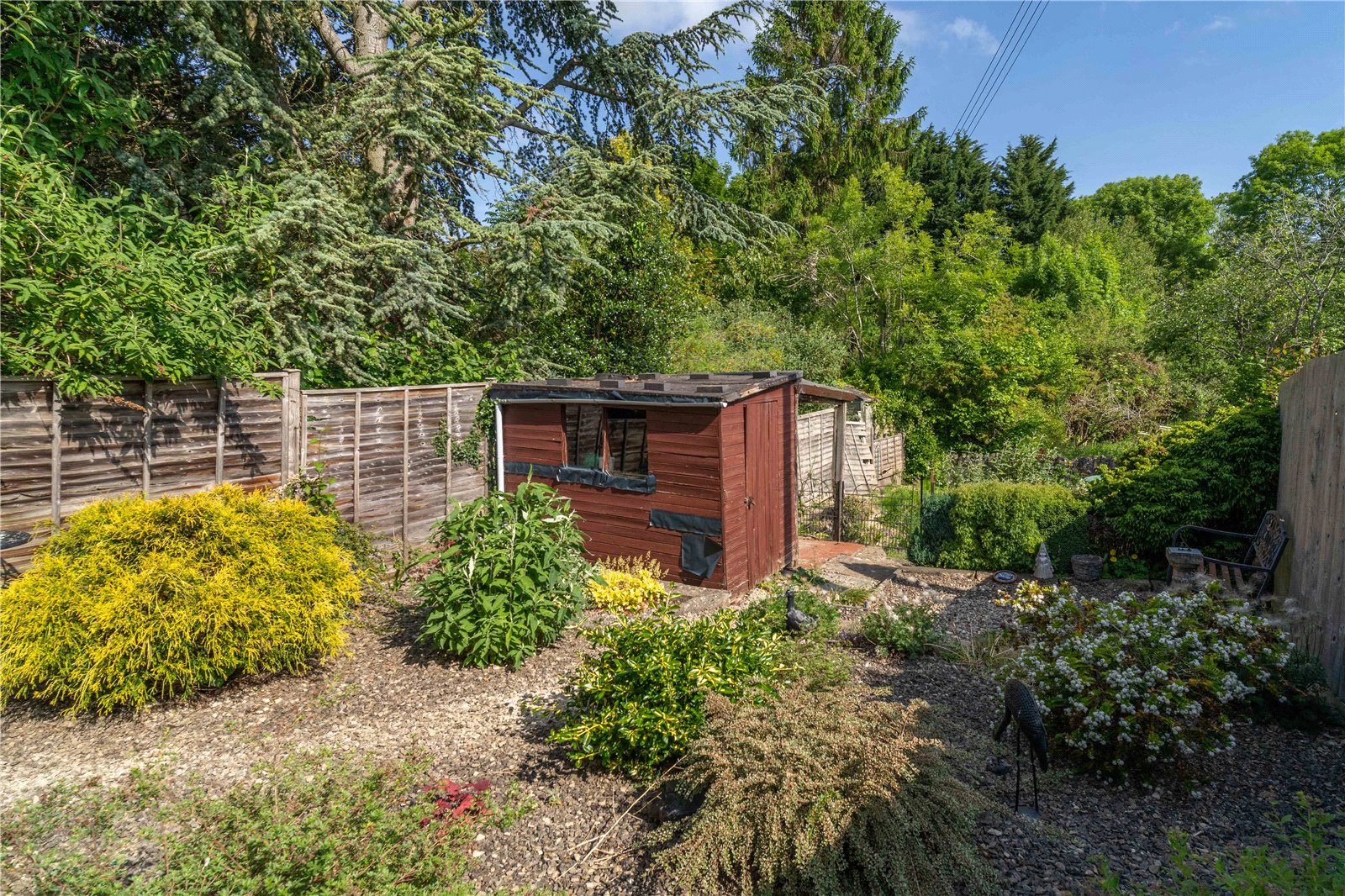 The garden extends to the side and the rear of the property and is predominantly hard landscaped with a range of mature shrubs and trees. There is a useful timber shed, log store and outbuildings in addition to a detached garage and gated driveway parking.