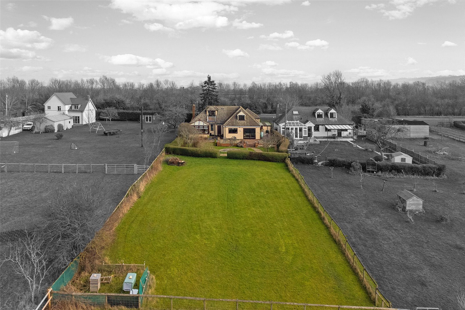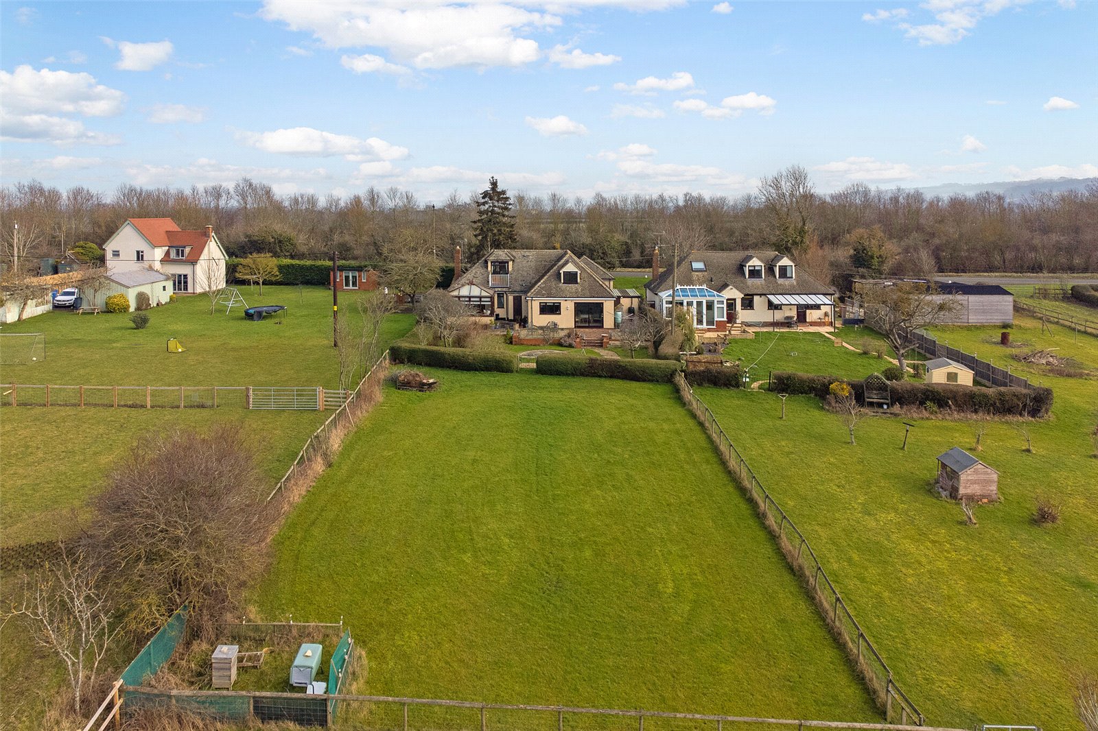The property is accessed via a private tarmac driveway, providing parking space for multiple vehicles and a double garage with ‘up and over’ doors, power, and lighting, as well as a workshop equipped with power, light, and water. A wrought iron gate leads to the rear garden, which is predominantly laid to lawn and features a paved terrace, mature trees, borders, beyond which is a gate that provides access to the small paddock.