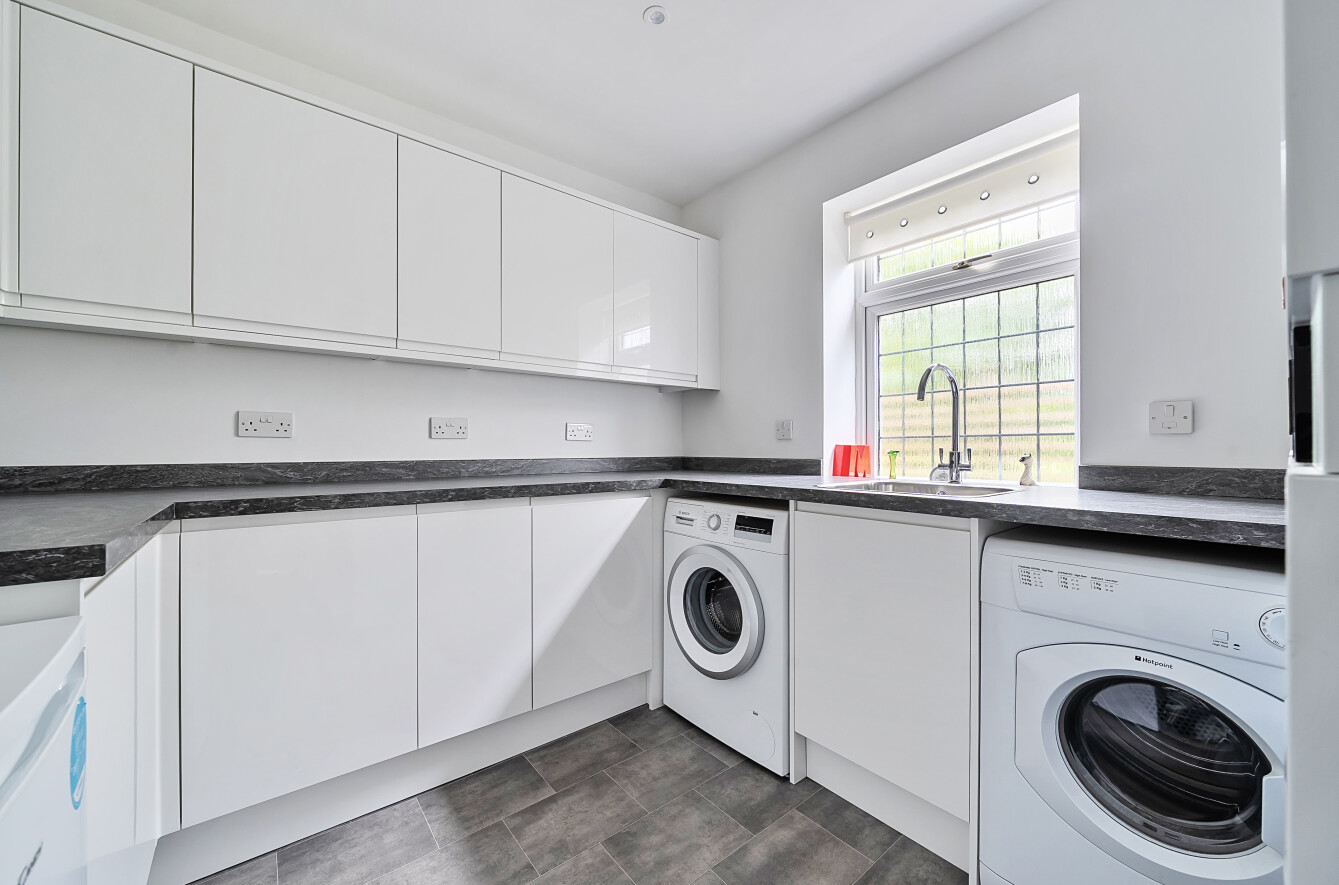 The front door opens into a wide inviting entrance hall leading to the dining room, study, utility room with fitted units and space for appliances plus a two piece downstairs cloakroom. The double aspect living room has a feature fireplace and double doors leading out to the large conservatory which has stunning views of the rear garden.