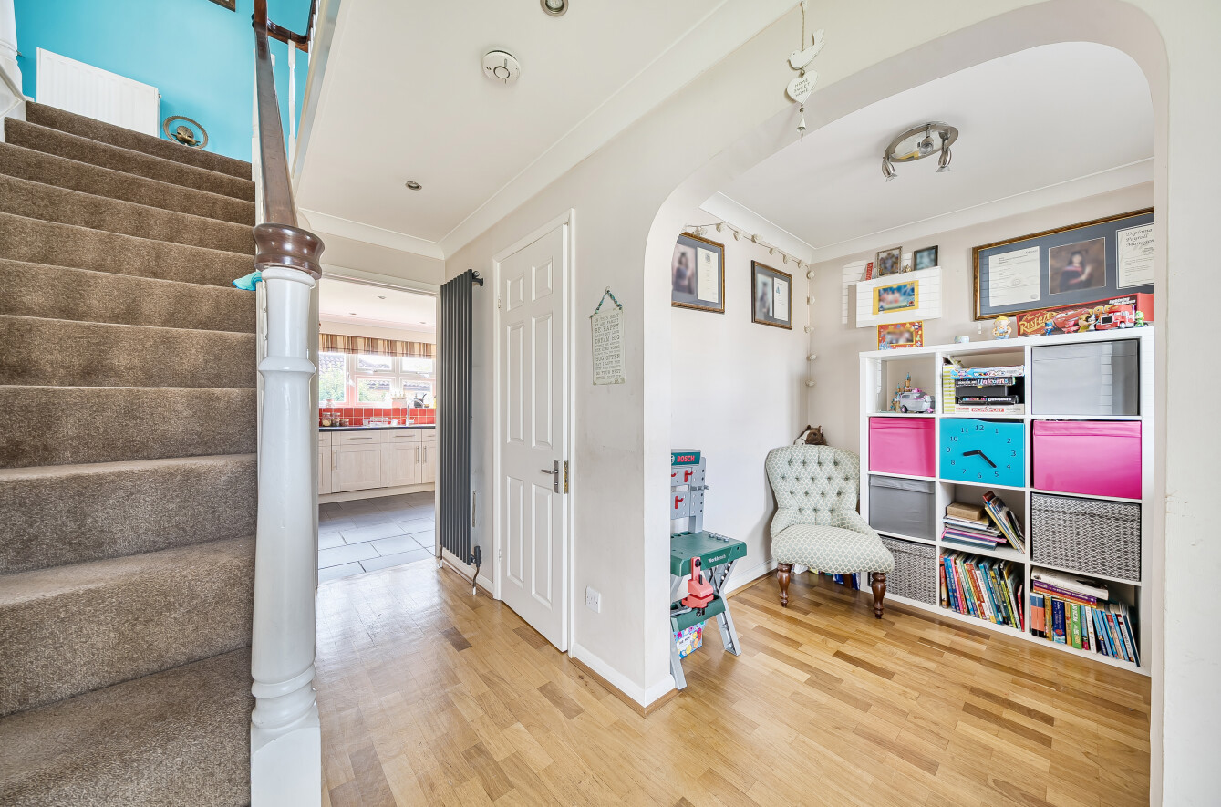 The front door opens into a spacious central entrance hall with a two piece downstairs cloakroom. To the front of the property is an elegant living room with a feature fireplace and a separate study. An archway leads from the living room into the dining room at the rear with double doors opening out to the rear garden.