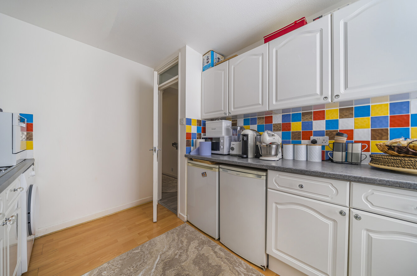 The generously sized reception room provides an abundance of natural light and leads out to a private balcony. The well-appointed kitchen is fully equipped.