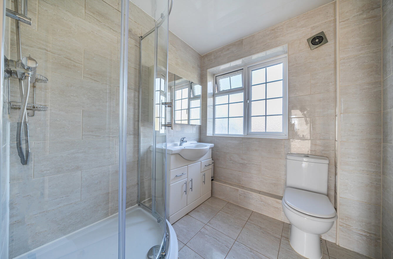 On the second floor, there are two double bedrooms with built-in wardrobes, along with a single bedroom. The family bathroom is fully tiled and features a corner shower unit, a basin set into a storage vanity unit with mirrored cabinet above, and a window providing natural light and ventilation.