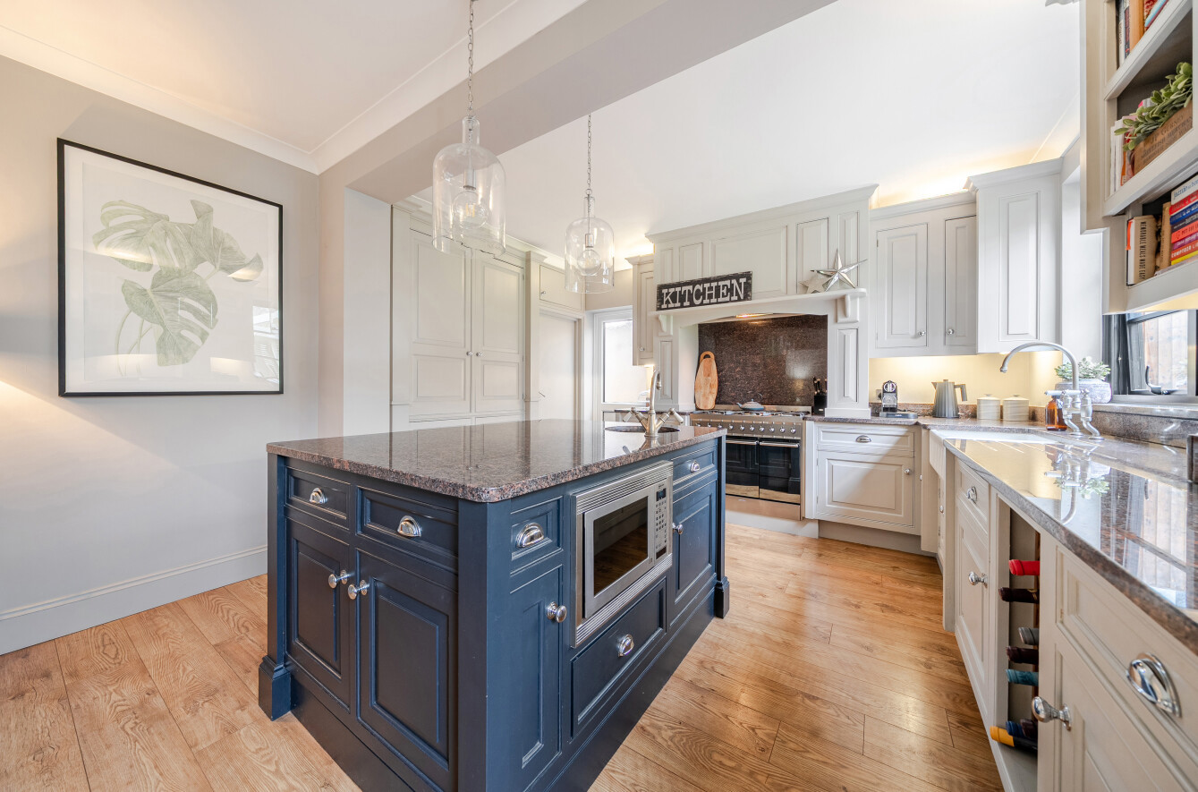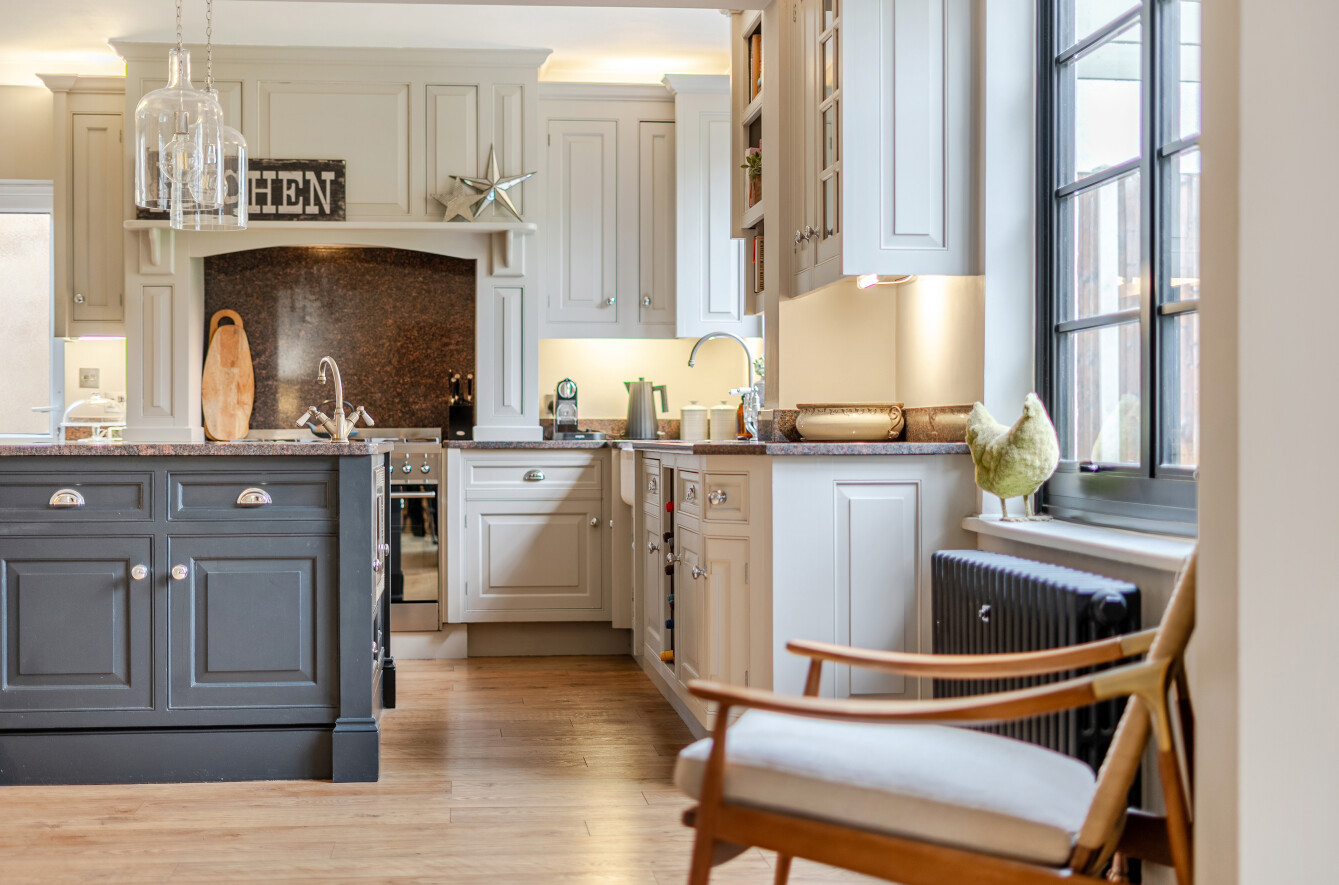 The kitchen provides a comprehensive range of cabinetry topped with granite work surfaces, complemented by display shelving, a large range cooker set within a dedicated nook, a wide Butler sink, an integrated wine store, a pantry cupboard and traditional-style radiators.