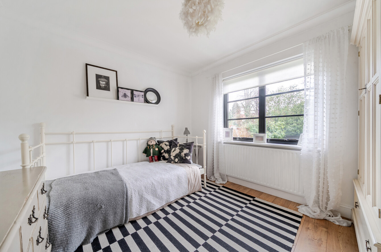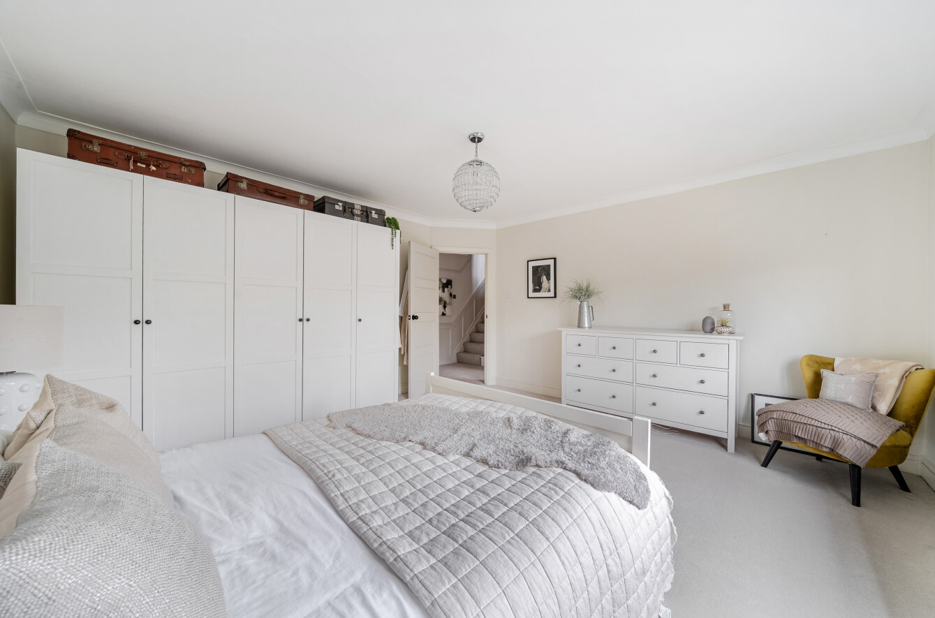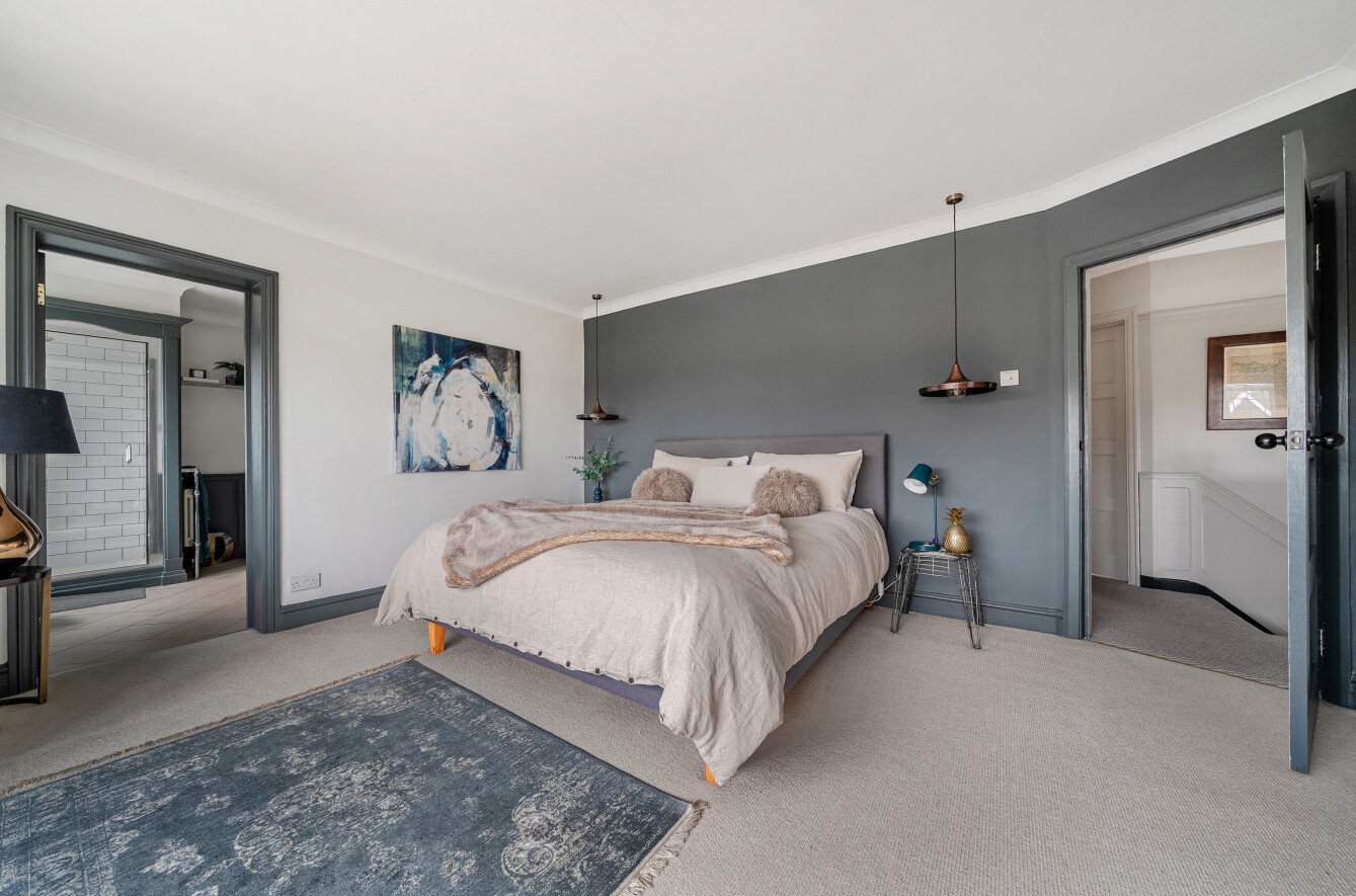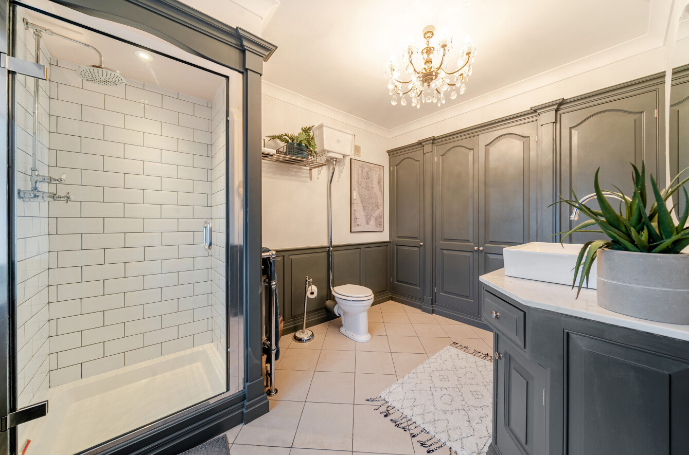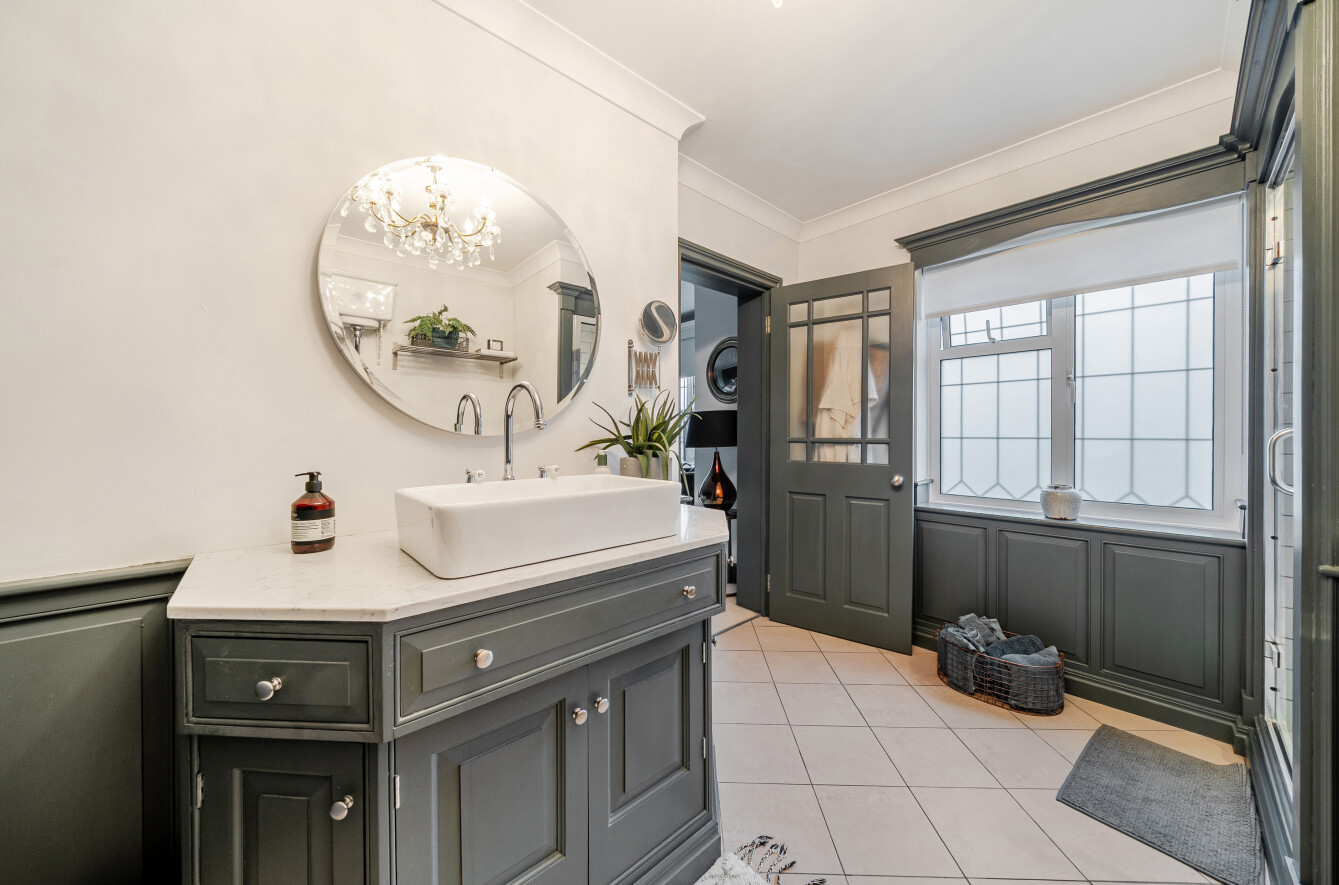 The first floor accommodates four bedrooms. The generous principal suite enjoys a wide window overlooking the front and is complemented by a traditionally styled luxury en suite. This features a wall of panelled fitted cupboards, a basin set on a granite-topped vanity unit and a shower enclosure finished with attractive subway tiling.
