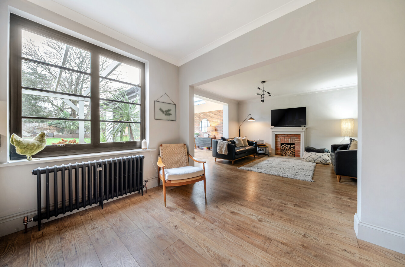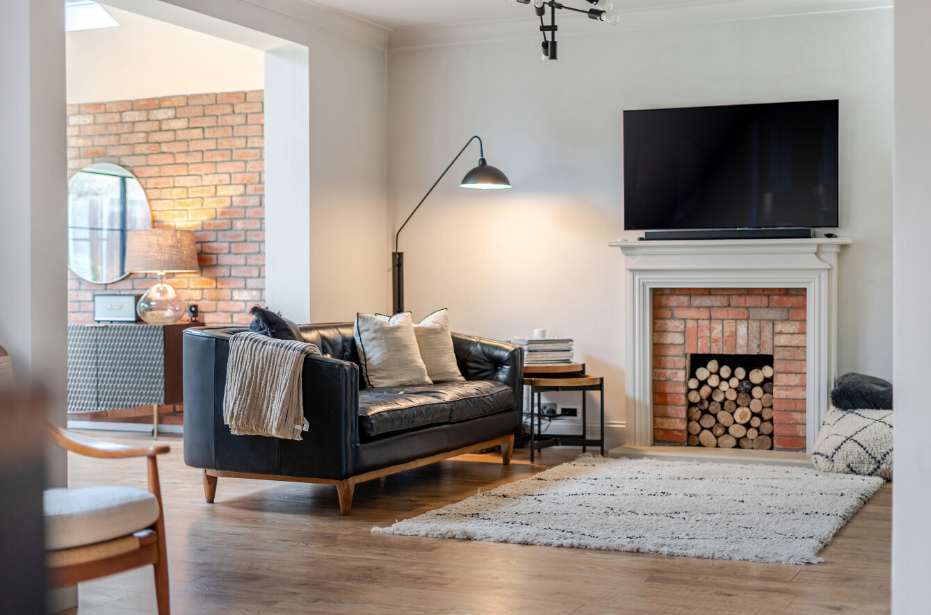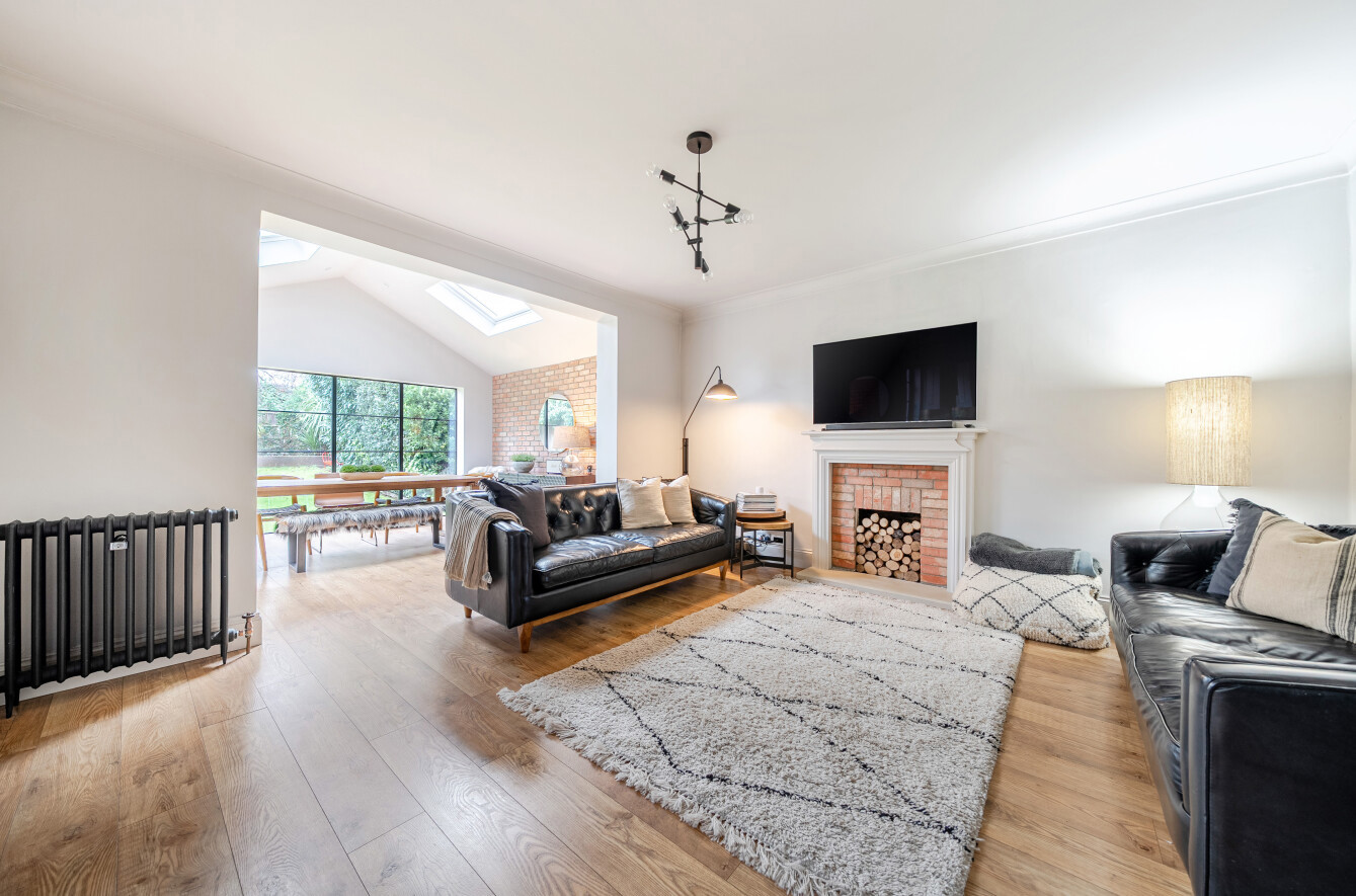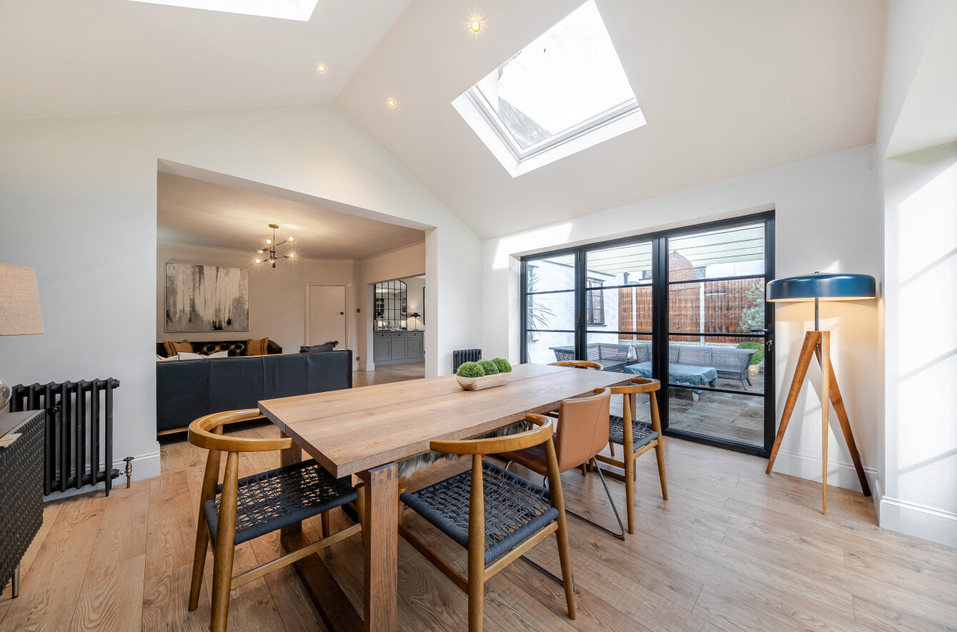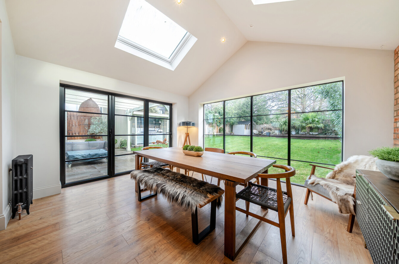 The reception area is centred around a brick fireplace, creating a cosy space for everyday living, while the dining area, with a brick feature wall, is positioned beneath two rooflights and surrounded by a wall of windows and bi-folding doors that open onto the patio and rear garden.