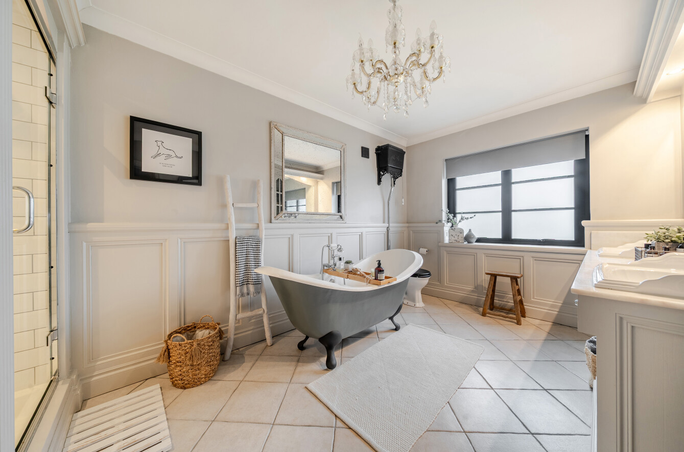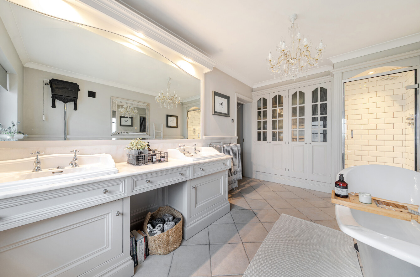 The family bathroom is another luxurious space, offering a curved freestanding bathtub, a separate shower enclosure, elegant wall panelling, a wall of storage cupboards and dual basins set within a marble-topped vanity unit with mirror above.