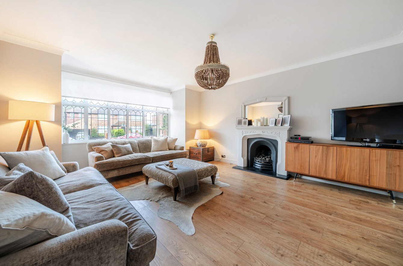 The impressive 263 sq ft principal reception room is positioned to the front and features a wide bay window with attractive leaded detailing. An additional imposing fireplace forms a striking centrepiece, adding both character and elegance to the room.
