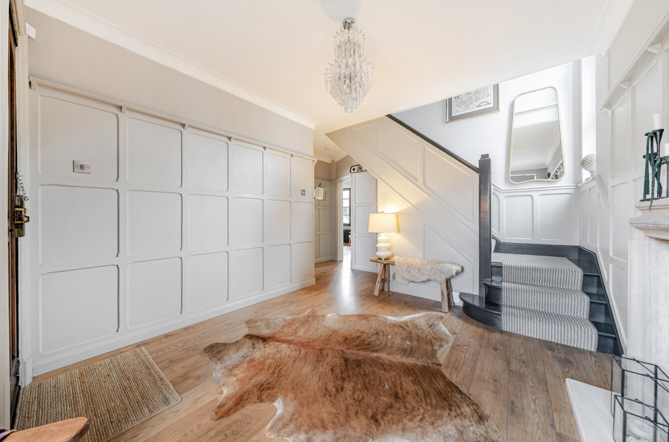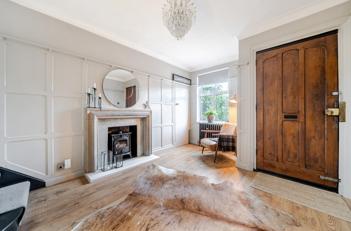 To the front, a neat, deep block-paved driveway provides off-street parking for several vehicles and is complemented by a covered porch. Upon entering, you are immediately struck by the stylish wall panelling and warm wood flooring that flows throughout the ground floor, while a stone fireplace creates a lovely focal point within the reception hall.