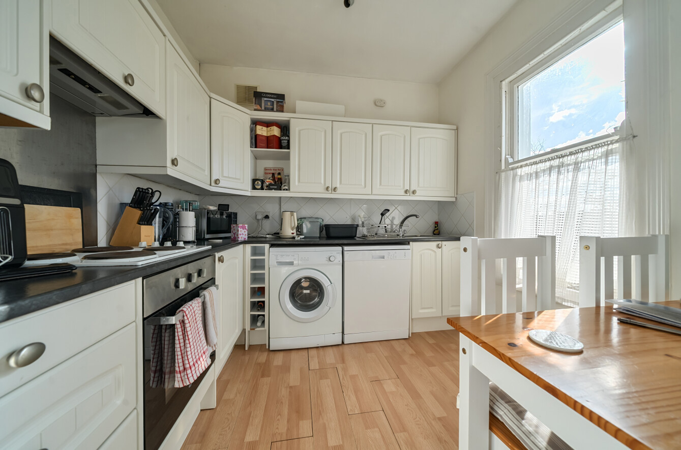 The apartment features two spacious double bedrooms, both comfortably accommodating wardrobes and additional furnishings. A bright and airy reception room provides an excellent setting for both everyday living and entertaining, while the separate kitchen is fitted with a range of units and offers ample worktop and storage space.