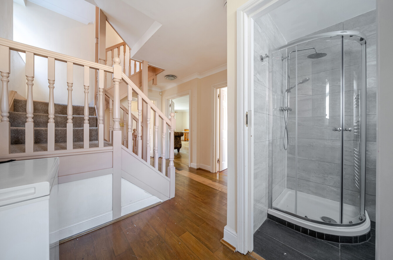 The kitchen/breakfast room is thoughtfully arranged and provides ample space for cooking and informal dining. Also located on this level is a guest bedroom with an en-suite shower room, perfect for visitors or adaptable as a home office. An additional shower room is conveniently positioned off the hallway.