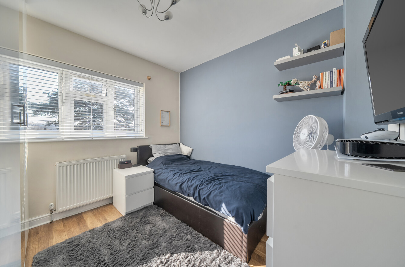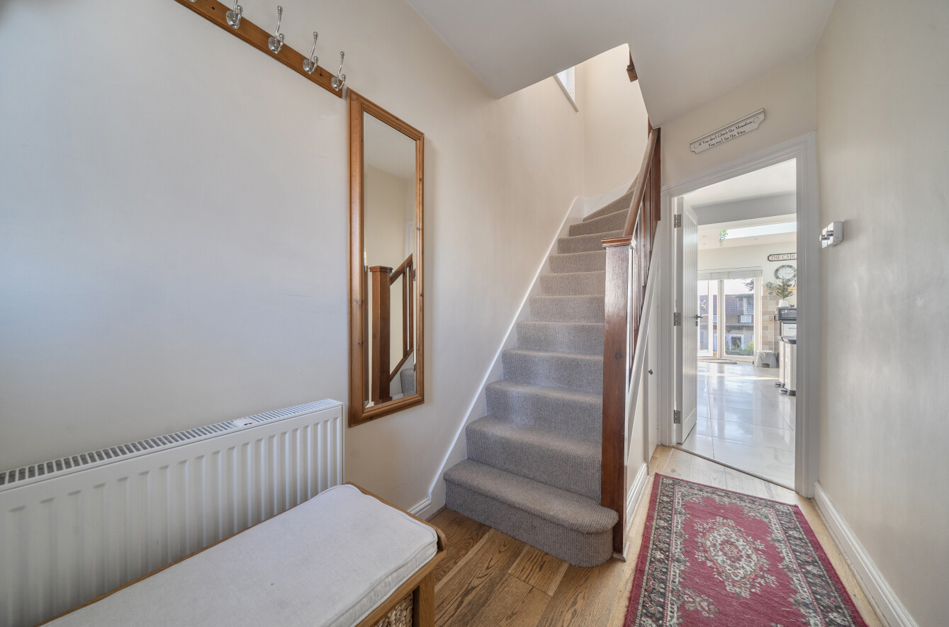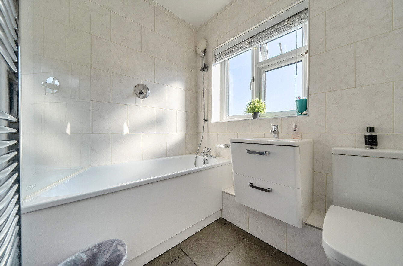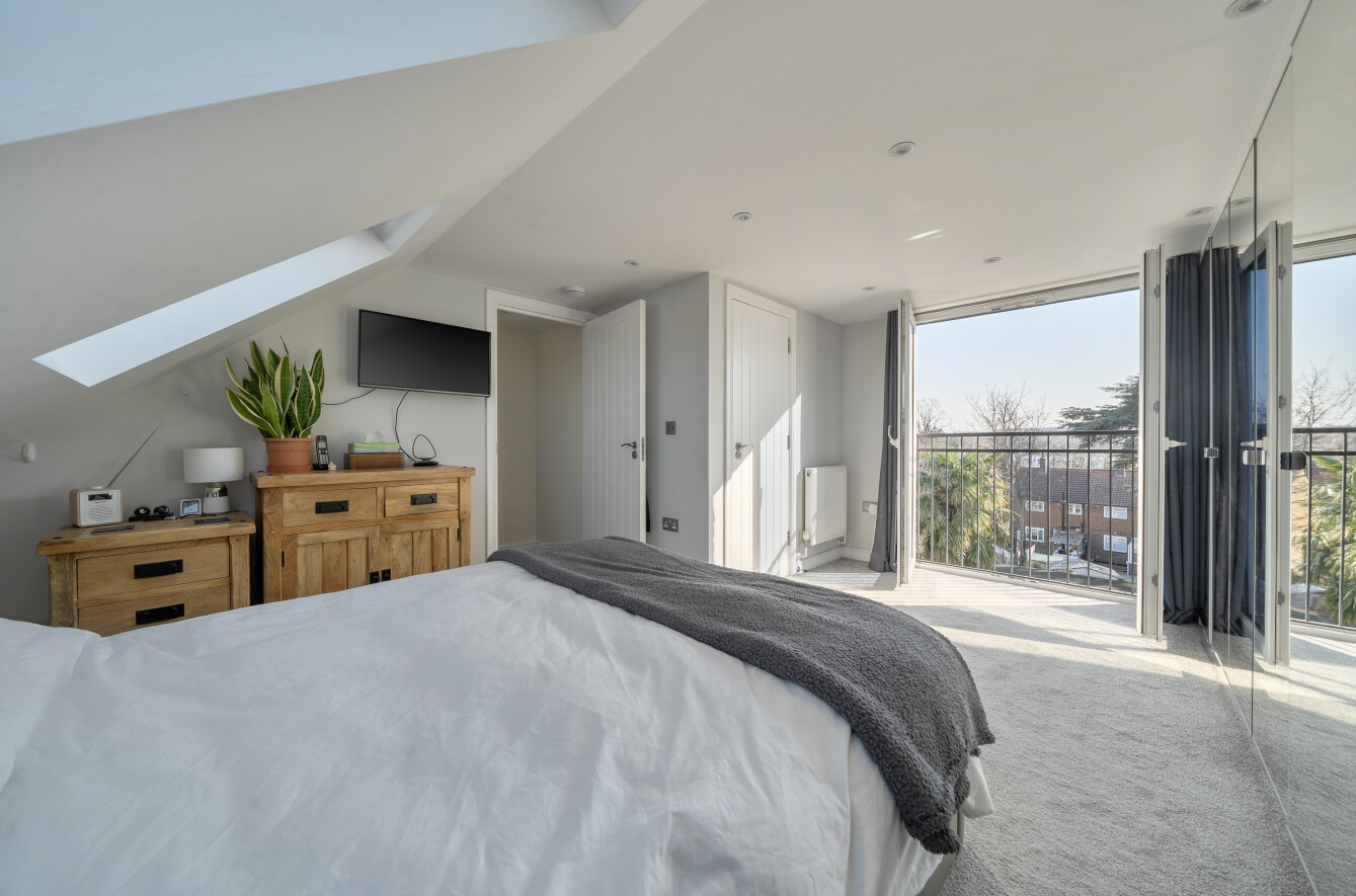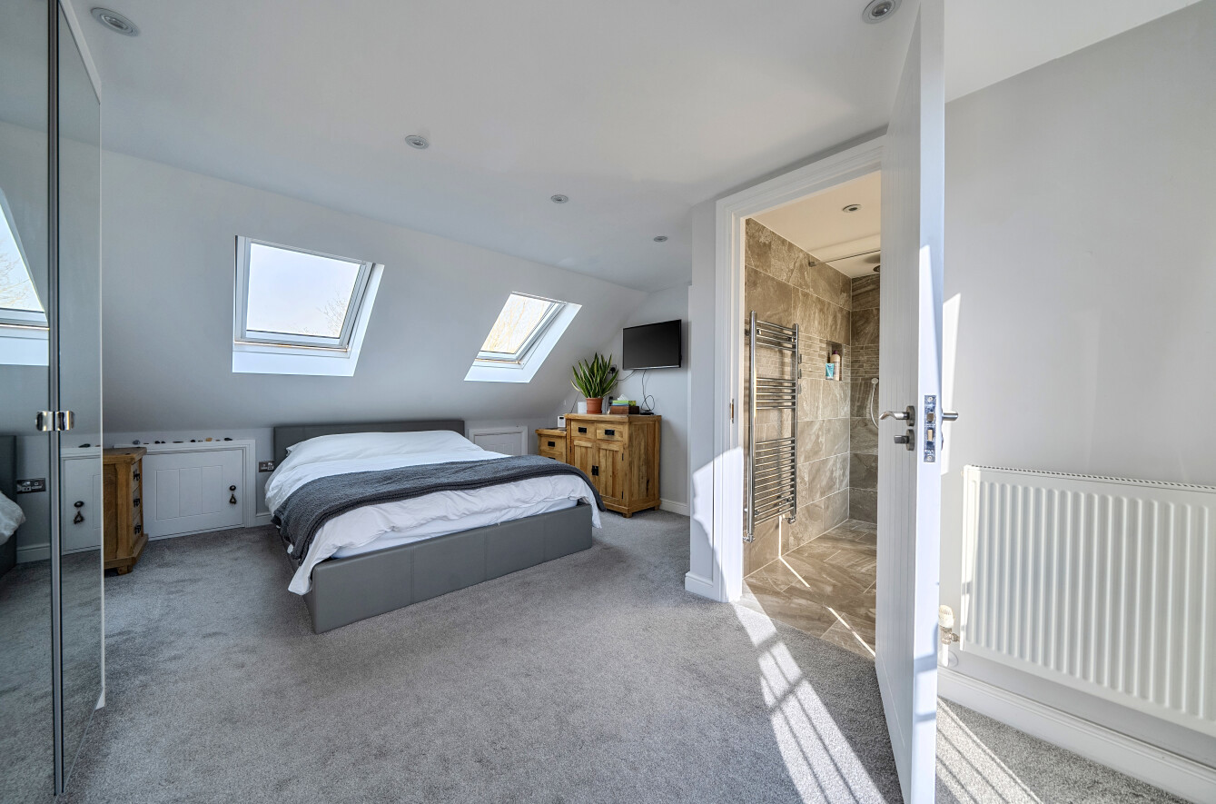 Upstairs, the first floor comprises two well-proportioned double bedrooms, and a contemporary family bathroom. The second floor has been thoughtfully converted to create an impressive principal bedroom suite, complete with eaves storage and its own bathroom, offering a private and peaceful retreat.