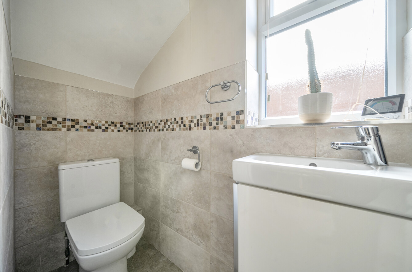 The property opens into a welcoming entrance hall leading to two bright and spacious reception rooms. The front reception features an attractive bay window, filling the space with natural light, while the second reception provides flexibility as a dining room or additional lounge. To the rear, a well-appointed kitchen overlooks the garden and offers ample storage and workspace, with direct access outside. A useful downstairs WC with integrated clothes drying area adds further practicality.