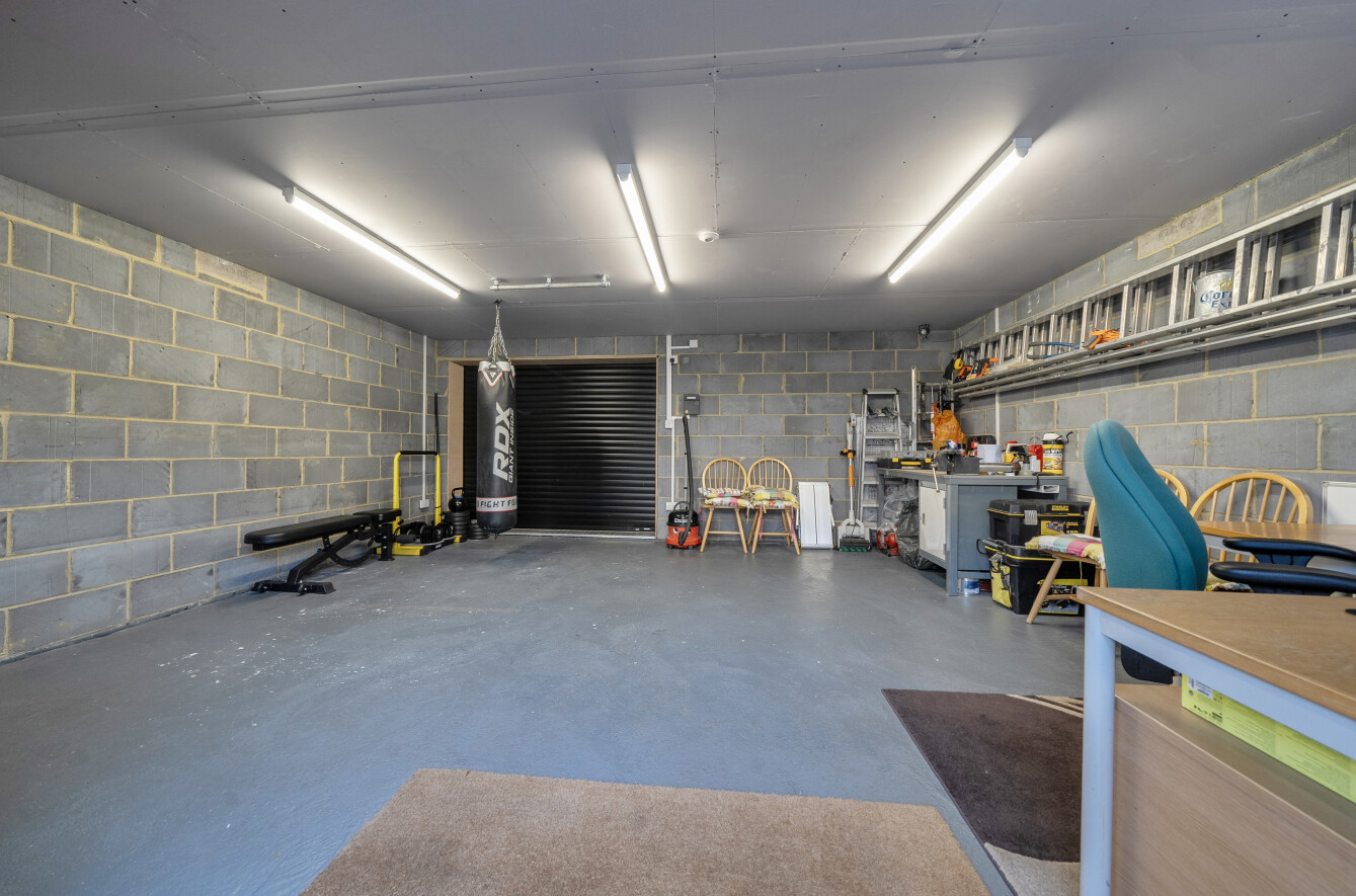 A substantial detached garage to the rear provides excellent additional space, ideal for use as a home office, gym, or workshop.