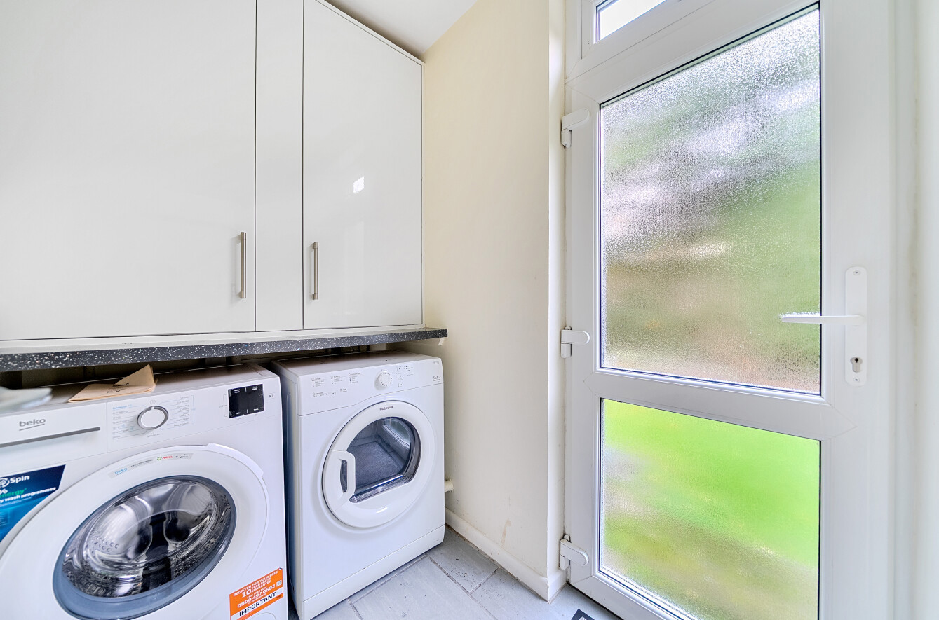 The property forms part of a desirable and neatly maintained close, offering bright and generous accommodation that includes two double bedrooms, a sizeable living room filled with natural light, and a contemporary fitted kitchen with the added benefit of a separate utility area. The bathroom is smartly presented, featuring both a bathtub and a separate enclosed shower.