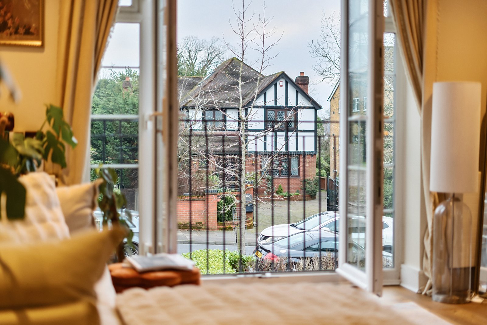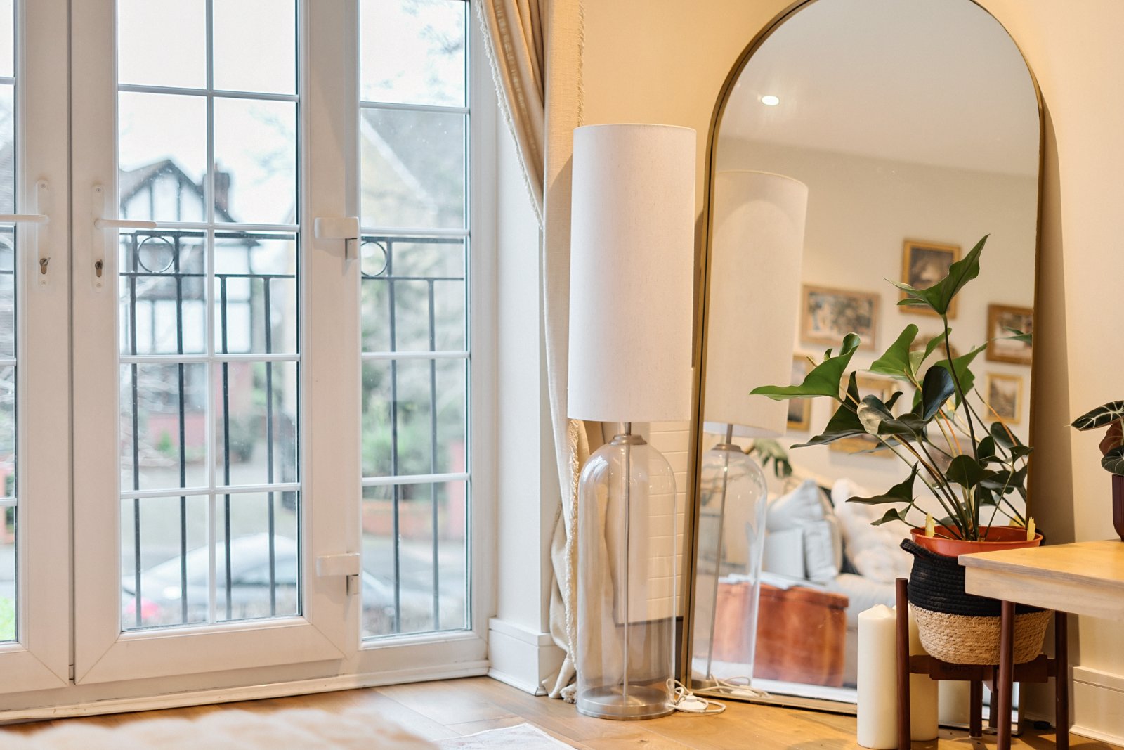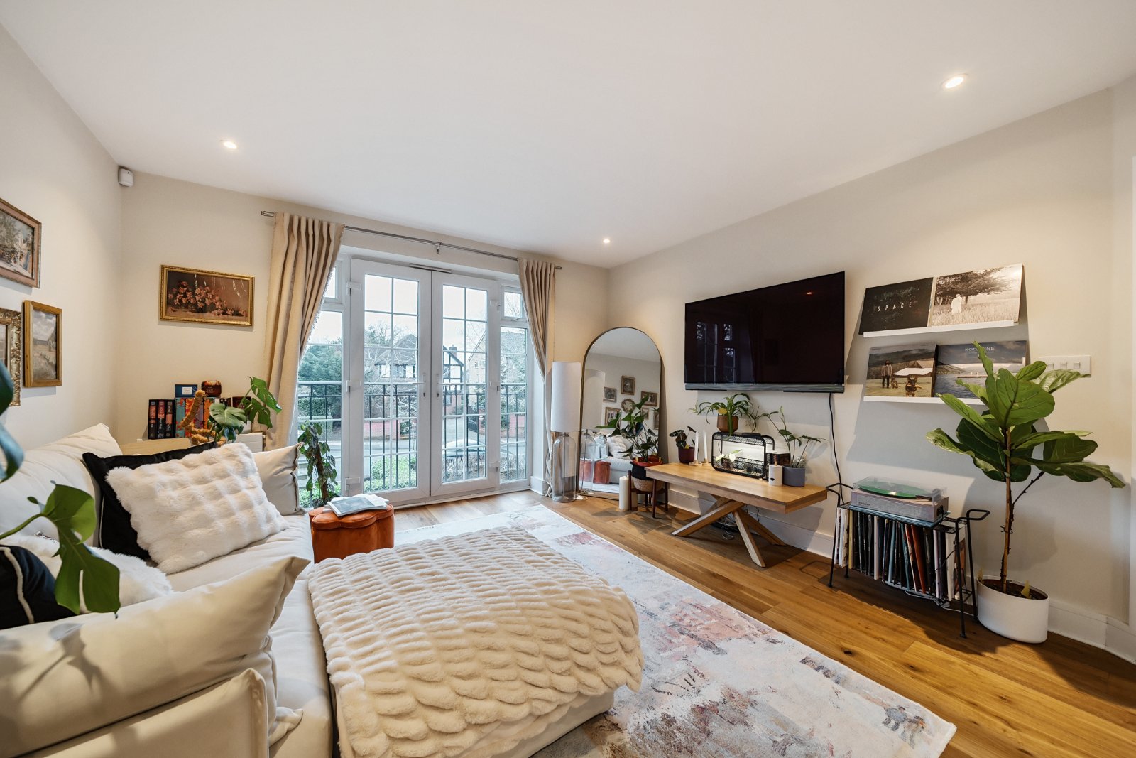 The spacious living area features a large lounge with French doors leading to a Juliet balcony, providing lovely views to the front of the building.