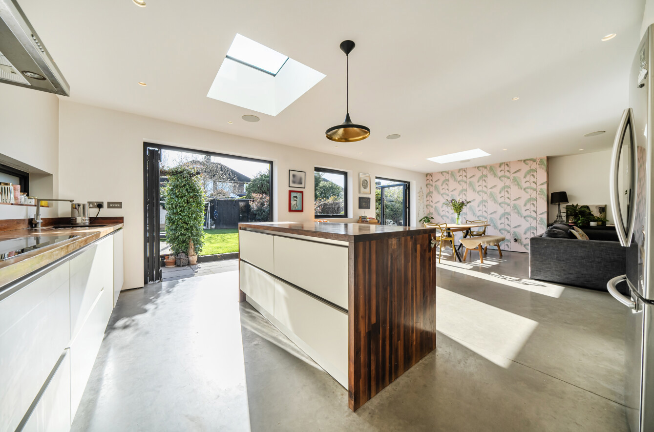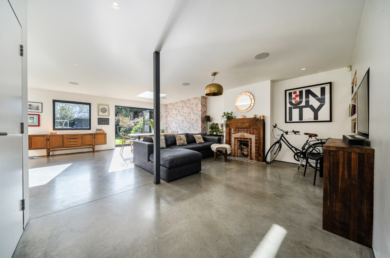 The heart of the home is the stunning open-plan kitchen / dining / family room spanning the full width of the property. Bathed in natural light, this exceptional space features polished concrete floors with underfloor heating, large-format glazing and bi-fold doors opening directly onto the south-facing garden, seamlessly connecting indoor and outdoor living.