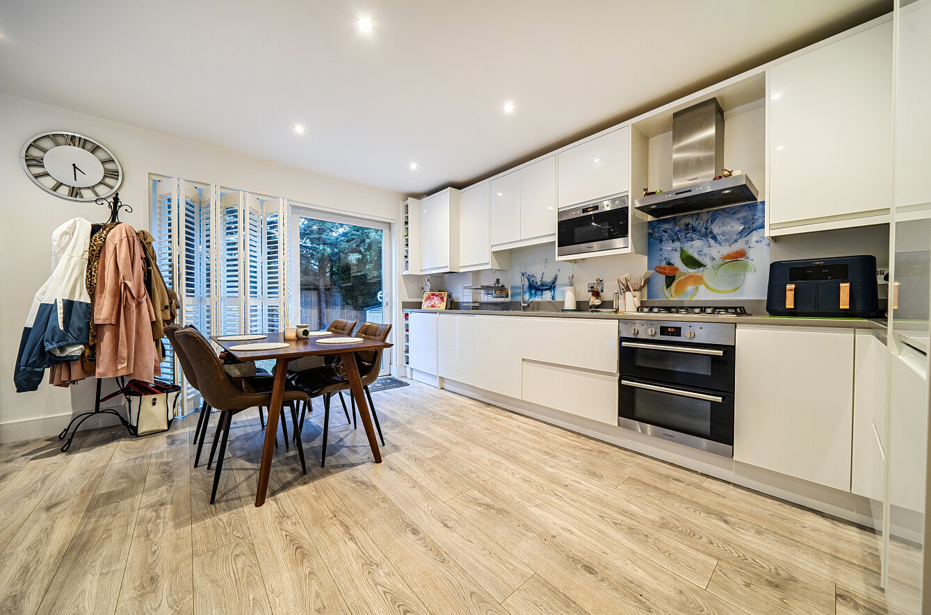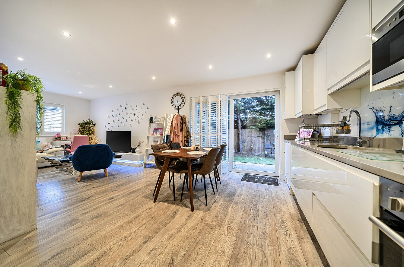 The property features a generous open-plan kitchen/reception room measuring approximately 26ft in length, providing ample space for both living and dining. Large windows and a door leading directly to the private garden flood the space with natural light, enhanced further by fitted Venetian blinds. The kitchen is well arranged with good worktop space and storage.