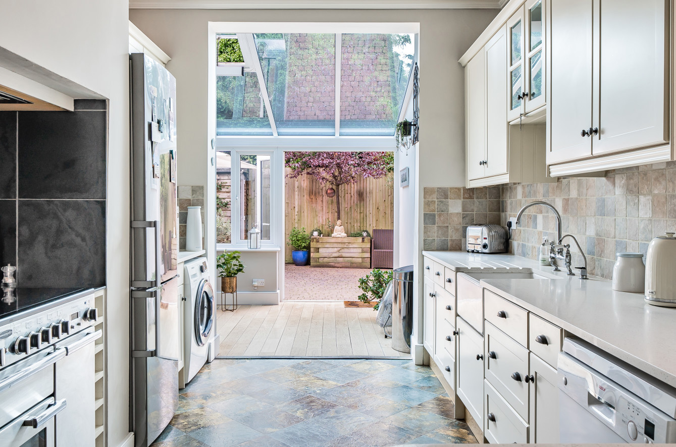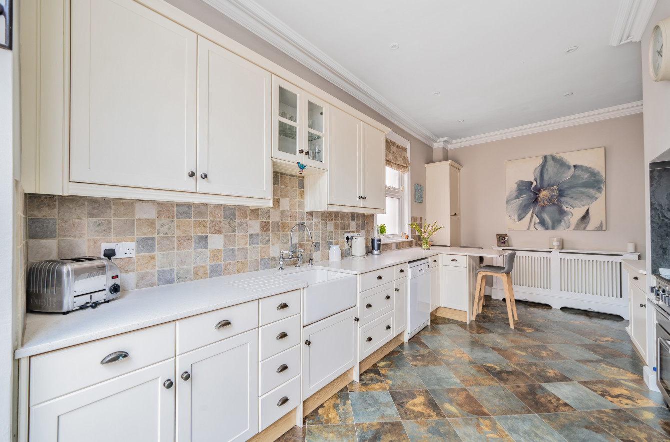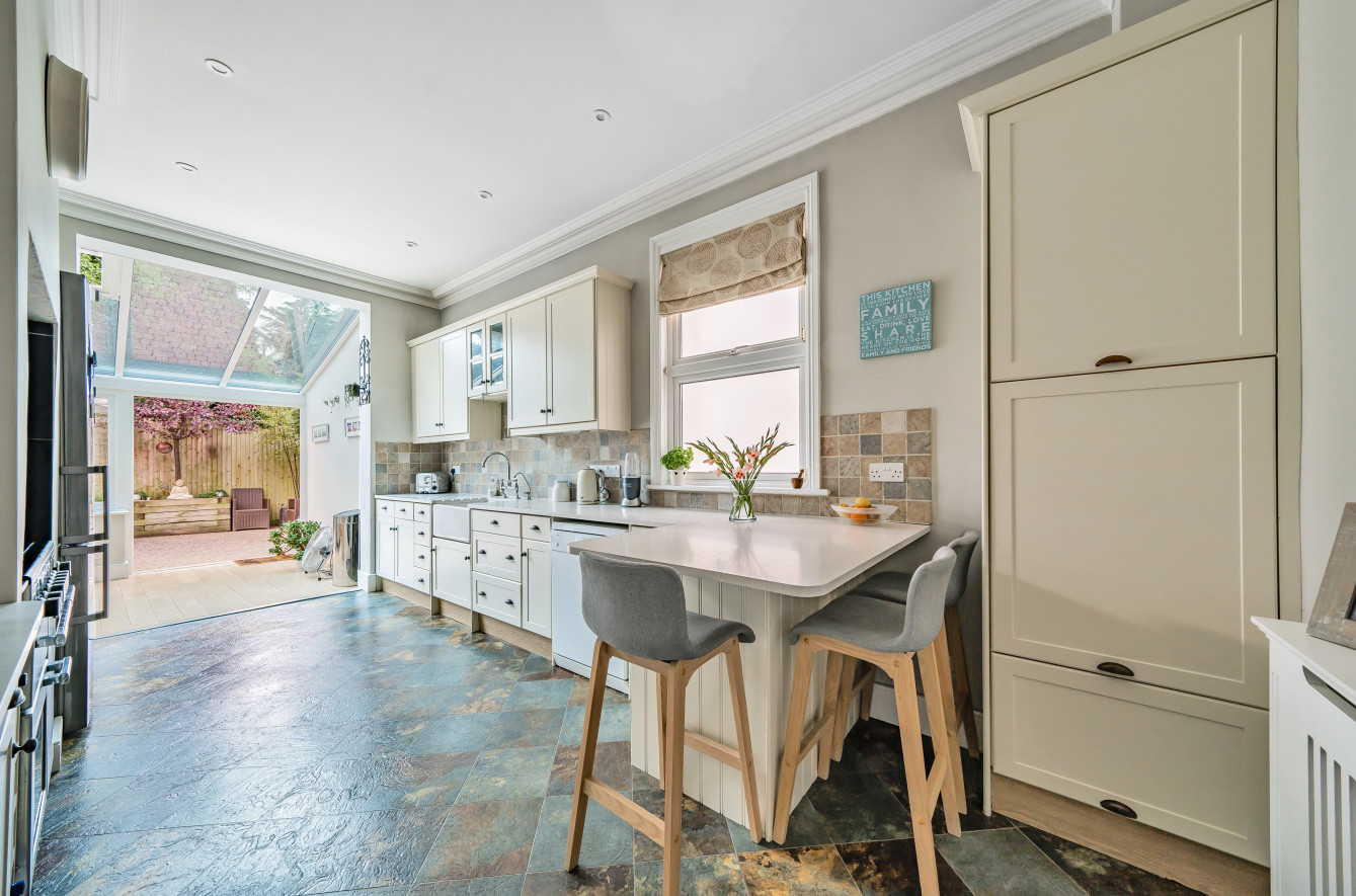The property greets you with a welcoming entrance hallway, setting the tone for what lies ahead. The spacious bay-fronted reception room features bespoke alcove cabinetry, an attractive fire surround, and new vertical UPVC sash windows. The timeless cottage cream Shaker style kitchen boasts Amtico flooring, Corian work surfaces, a butler sink, a water softener, and a Rangemaster cooker. It seamlessly flows into the conservatory, which offers self-cleaning, sensor temperature/solar-controlled windows. An additional reception room currently serves as a separate dining room, providing versatile living spaces.