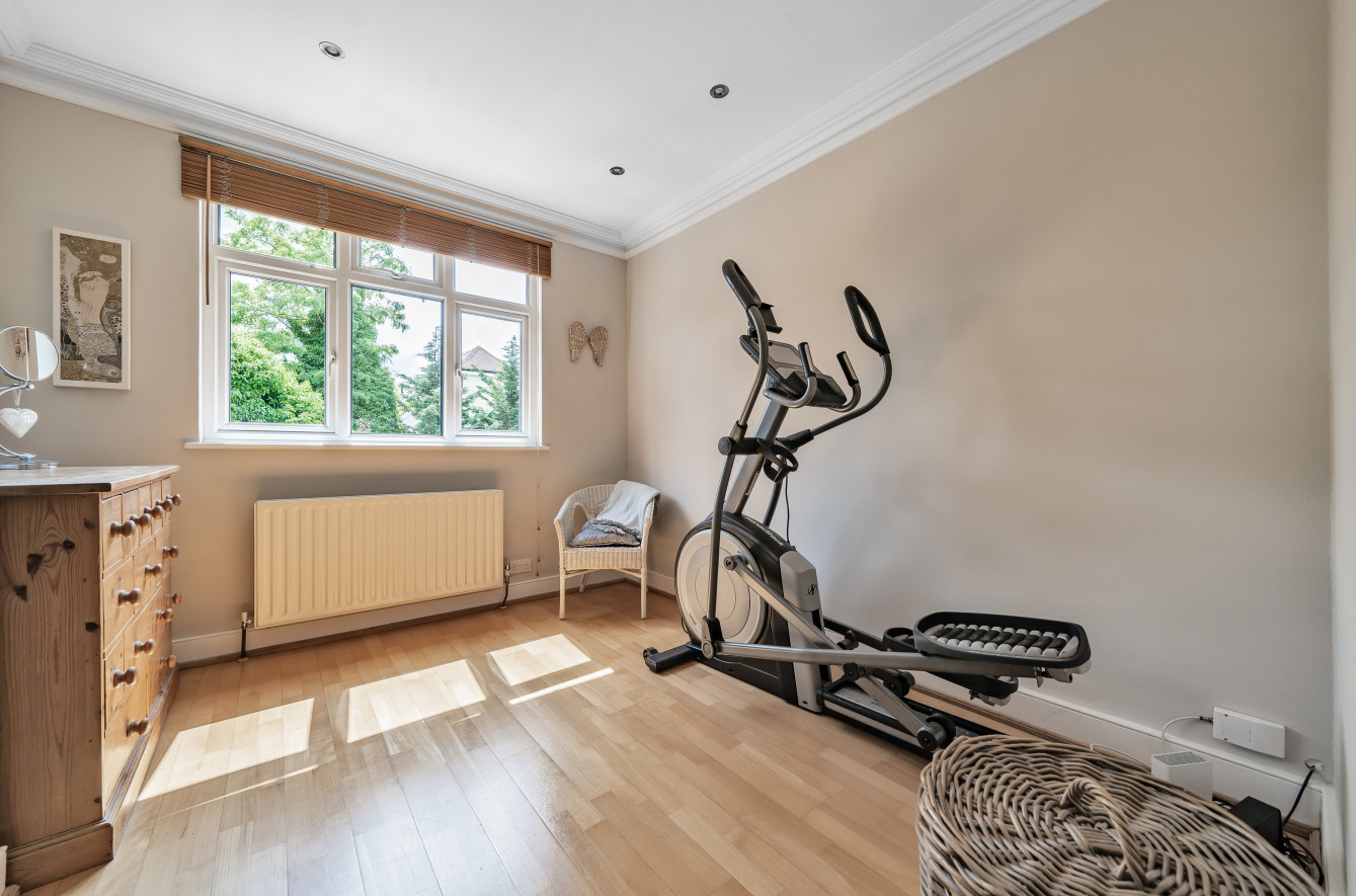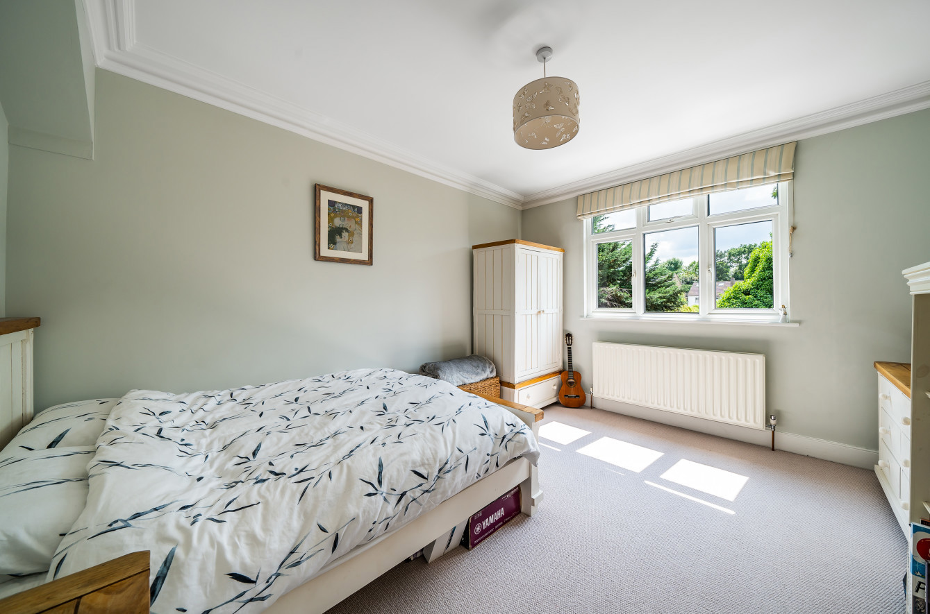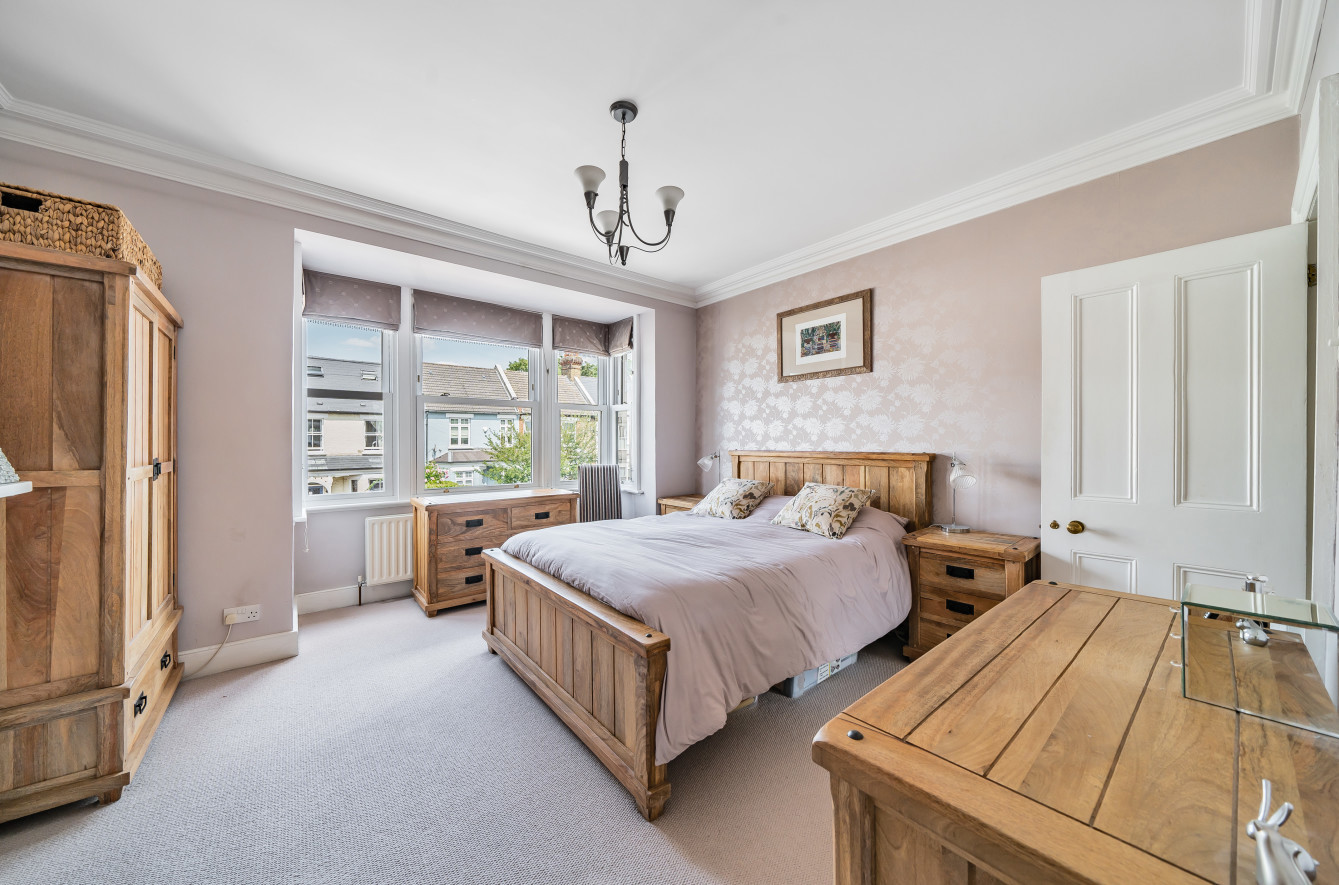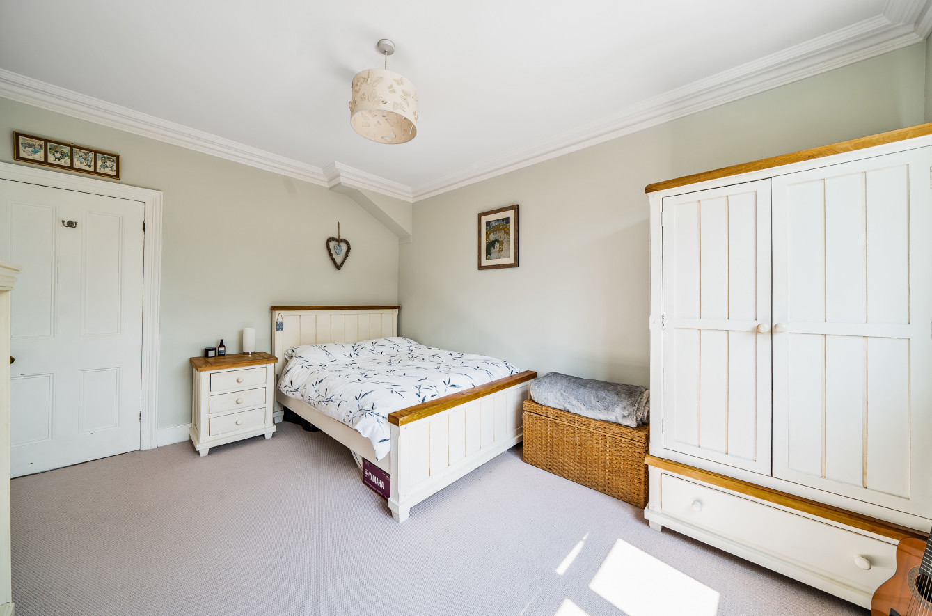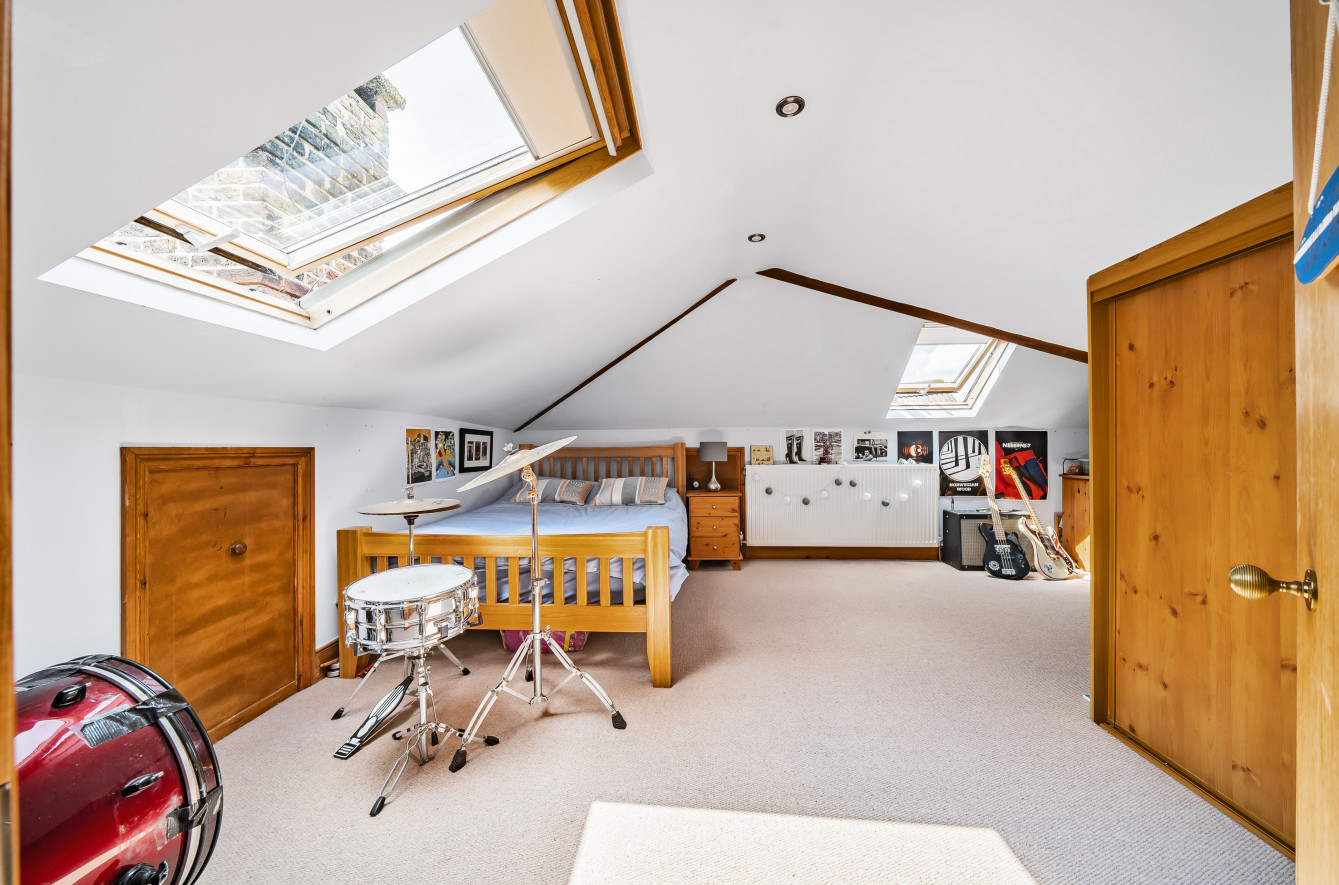 On the top floor, there is a fourth double bedroom filled with natural light from Velux windows. This spacious room boasts good head height, eaves storage, and built-in cupboards.