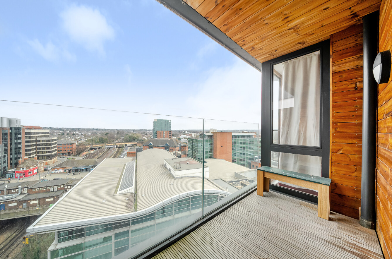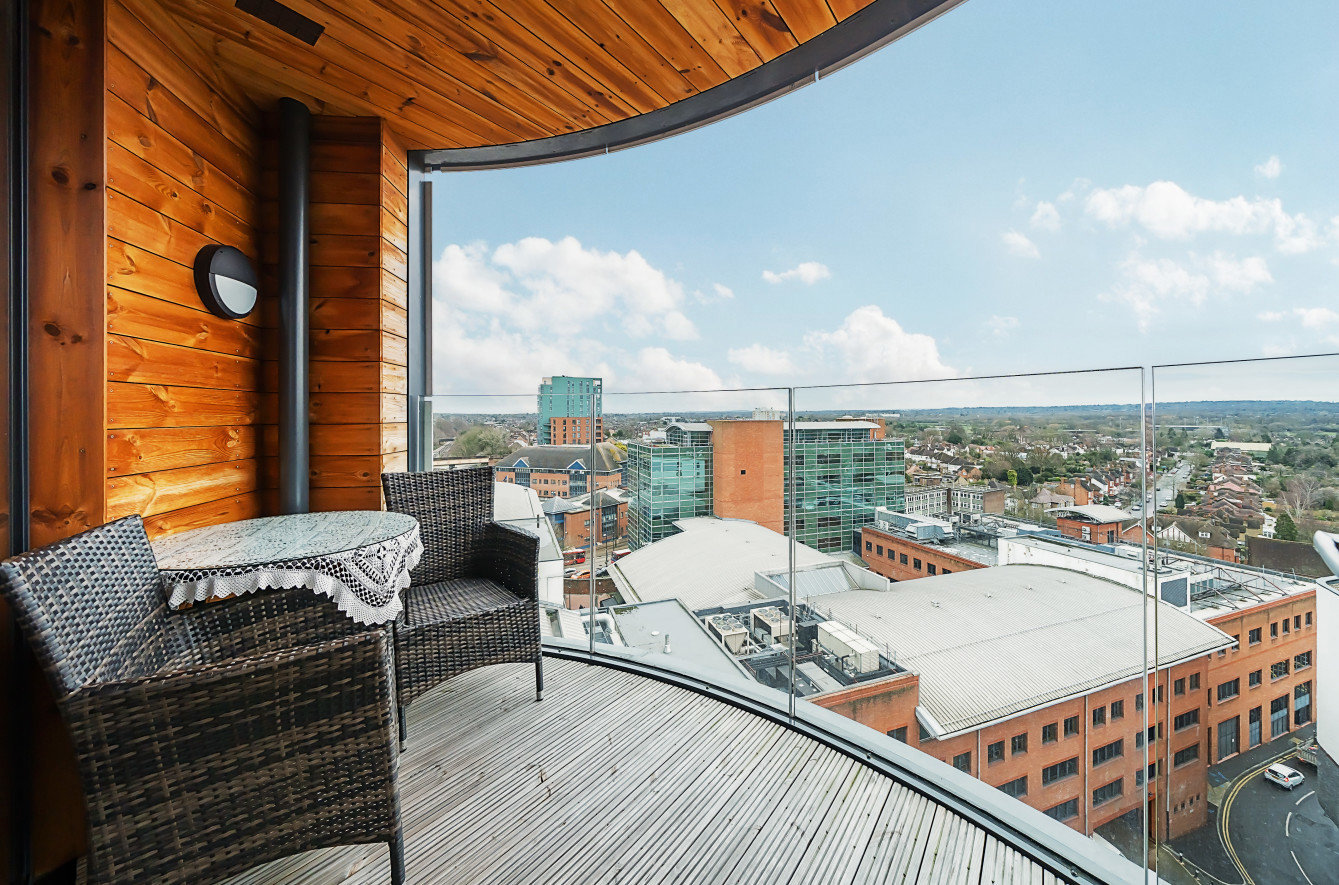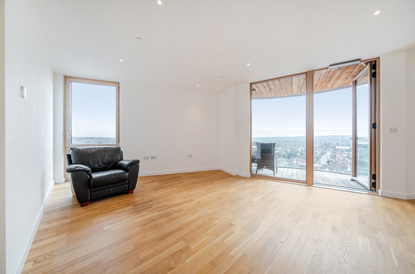 The accommodation comprises; open plan reception/kitchen with white high gloss units, access to a large terrace offering stunning views over Bromley, two double bedrooms, one with en-suite and balcony and a modern bathroom.