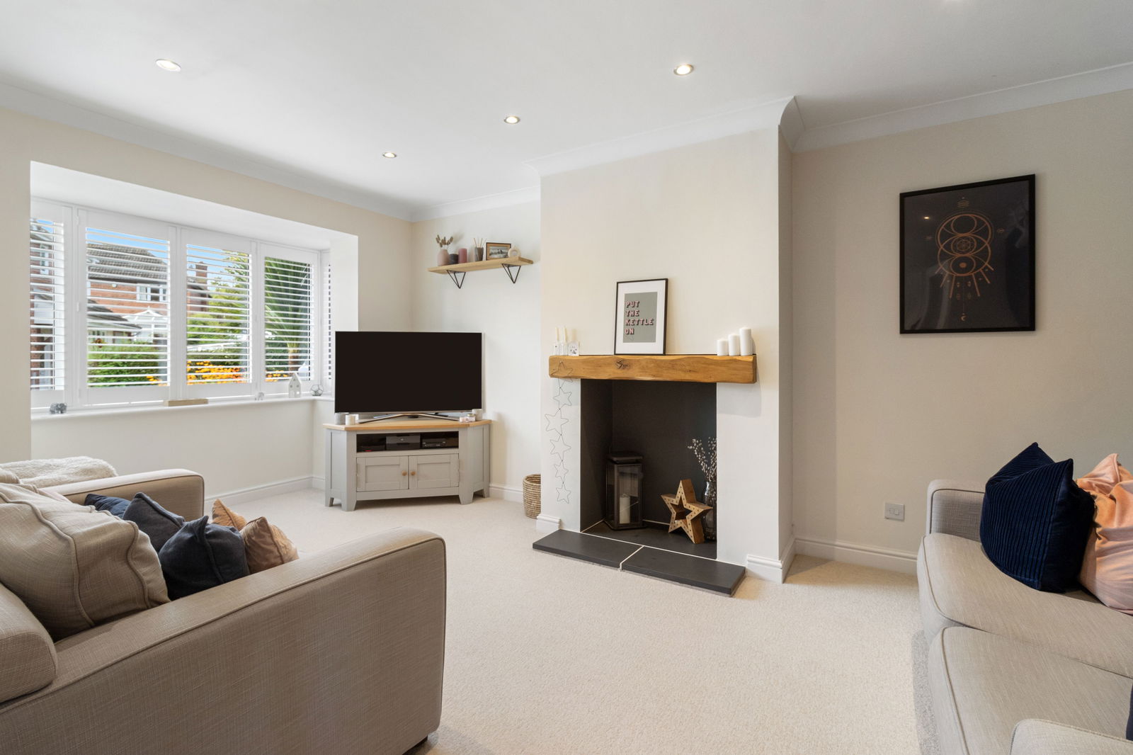 Attractive front facing bay window with contemporary white wooden shutters. Recessed spotlights. Radiator. Feature inglenook fireplace with slate hearth and oak mantle. TV point.
