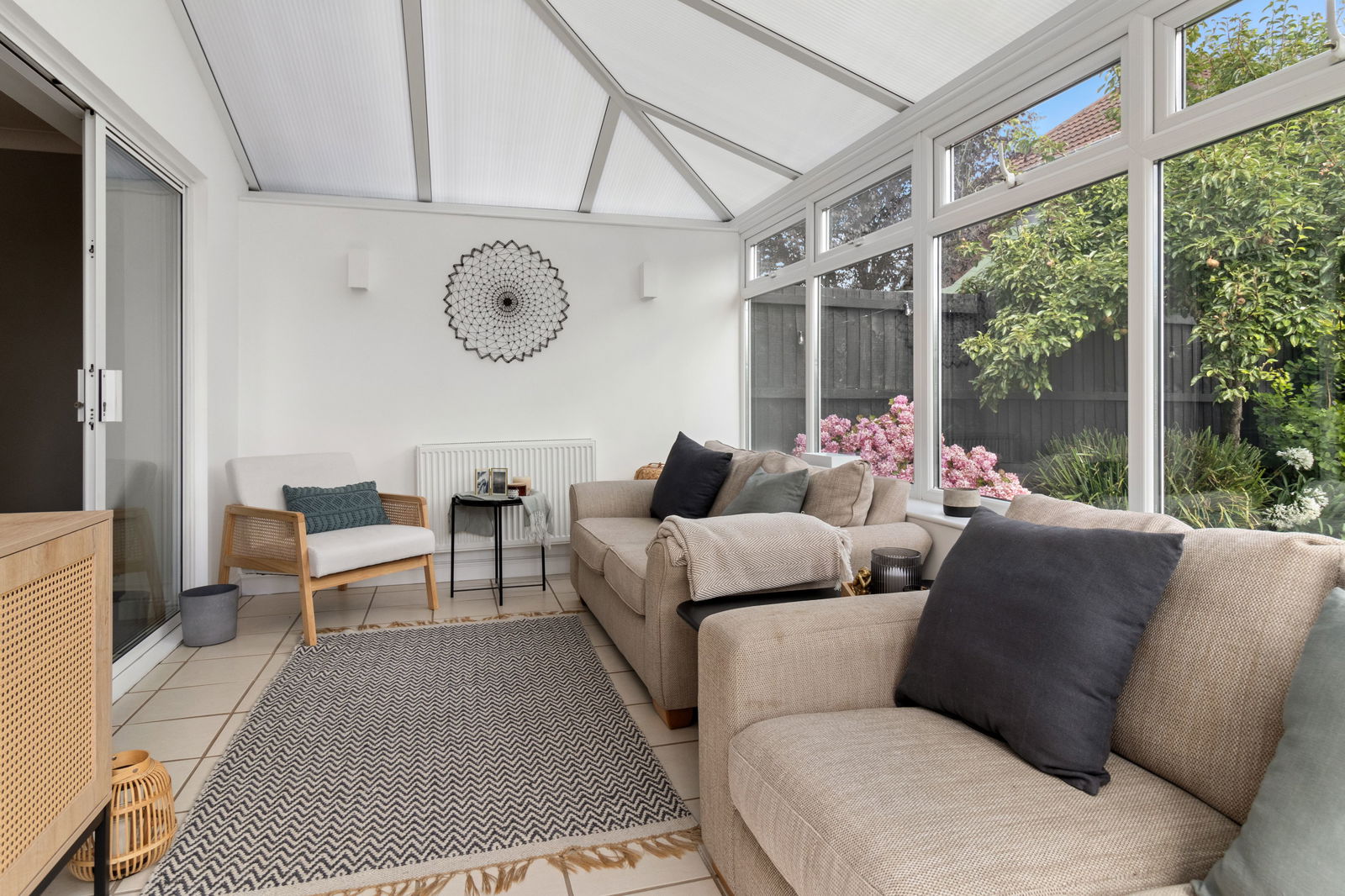 Flooded with natural light and enjoying a pleasant outlook across the garden. Wall lights. Radiator. Tiled floor. French doors to outside.