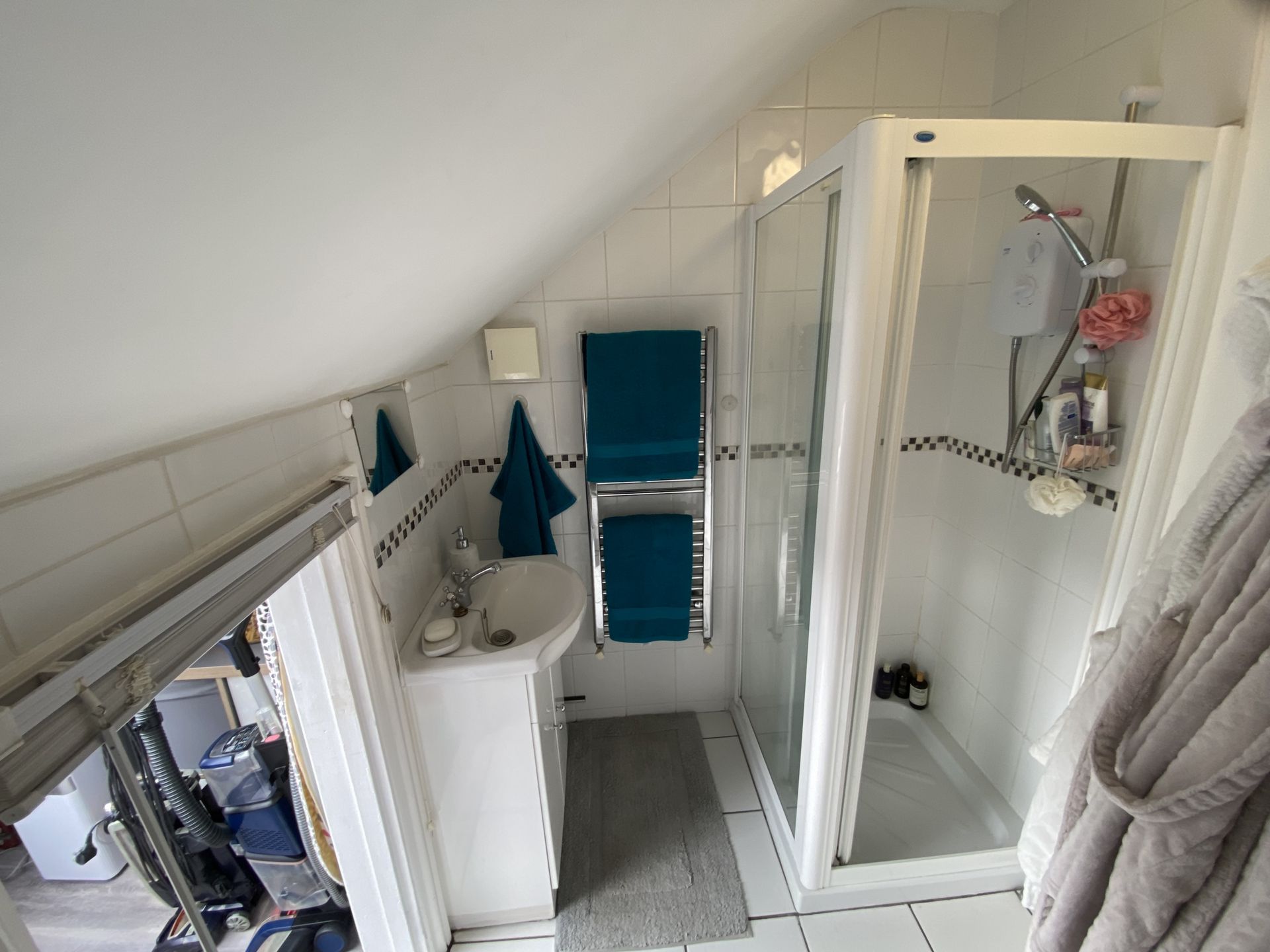 The spacious double bedroom has a built in wardrobe and window to the rear aspect. The shower room is fitted with a white suite including tiled shower cubicle with an electric shower. There is also access to a further storage area with large Velux window.