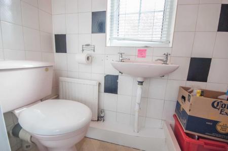 Obscure double glazed window to front, fully tiled shower cubicle, low level W/C, wall mounted hand wash basin, radiator, tiled walls.