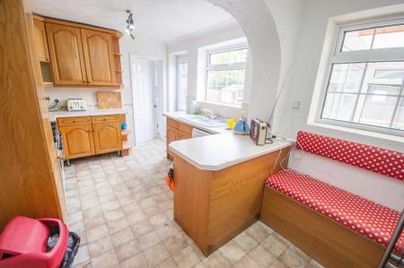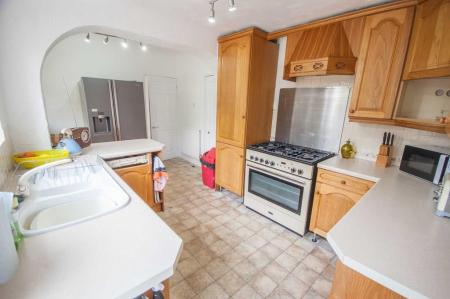Two double glazed window to rear, UPVC door to rear, door to utility room, range of wall and base units, rolled edge work surfaces with sink inset, space for american fridge freezer, dishwasher, rangemaster cooker with stainless steel splashback and extractor over, large under stairs cupboard, radiator, part tiled walls.