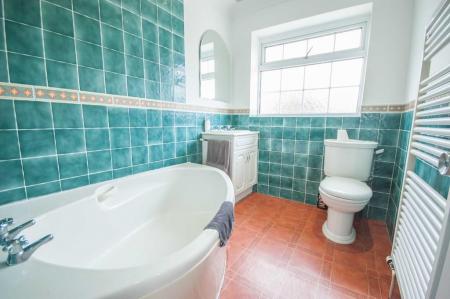 Obscure double glazed window to rear, corner bath with shower over, vanity hand wash basin, low level W/C, towel radiator, part tiled walls.