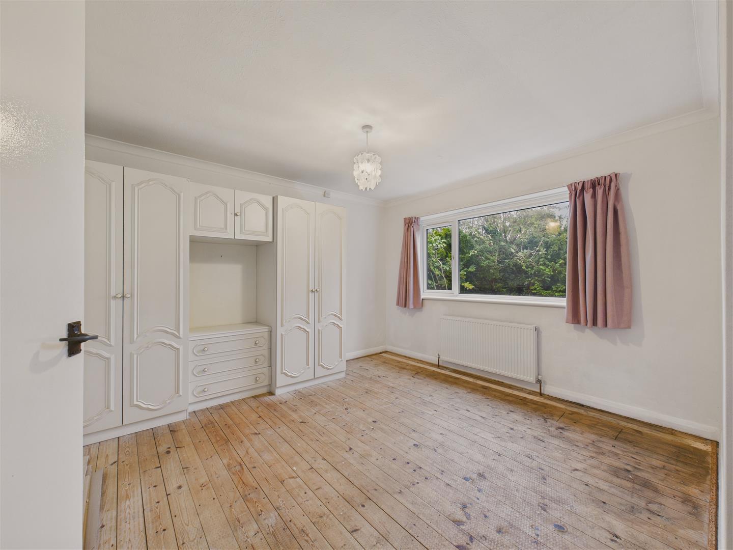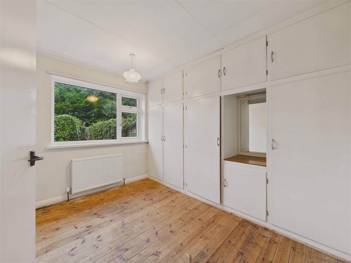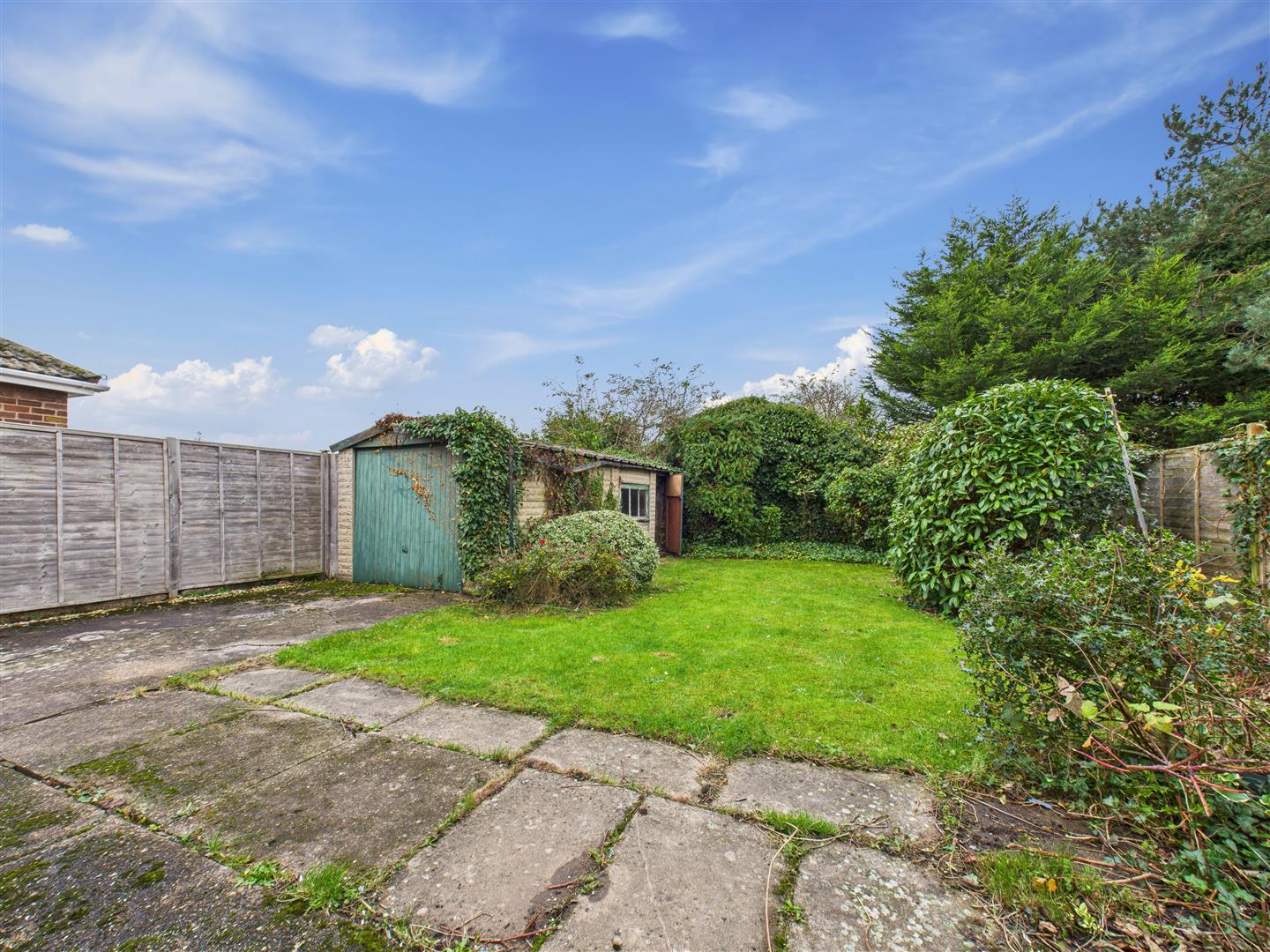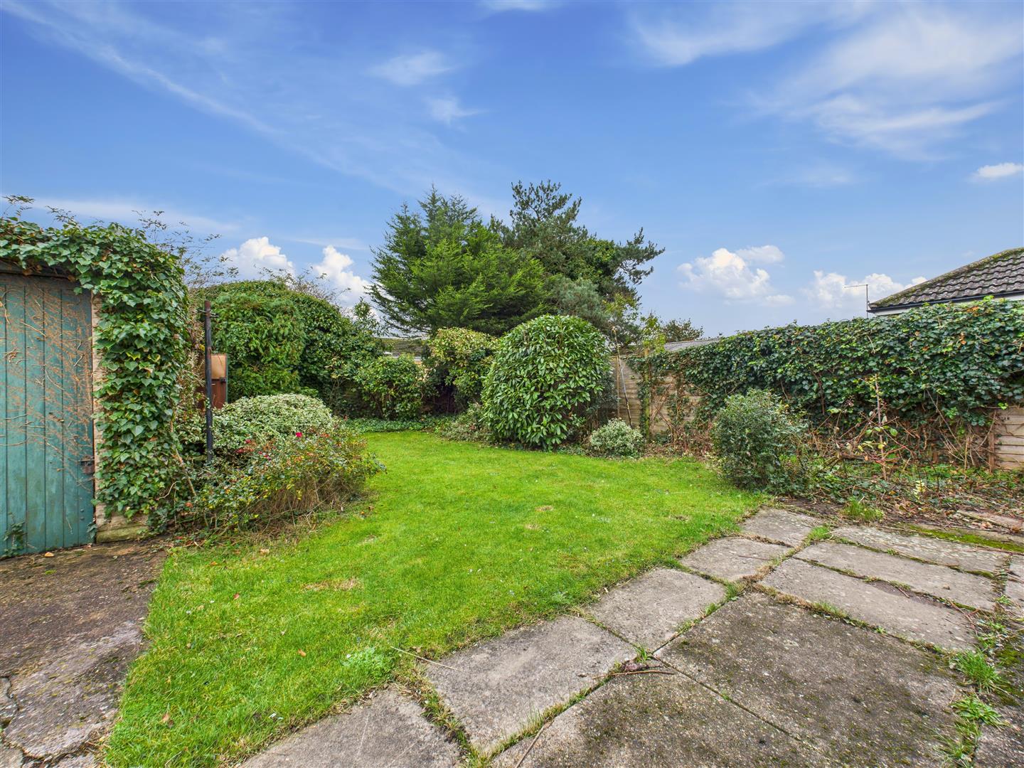 Externally, the plot offers manageable outdoor space. A lawned front garden sits with mature shrubs. A side drive provides off-road parking and leads to the detached garage. The rear garden, featuring a lawn and established shrub borders, is waiting for a buyer to dedicate time to landscaping and tidying, providing a perfect blank slate for outdoor enjoyment.