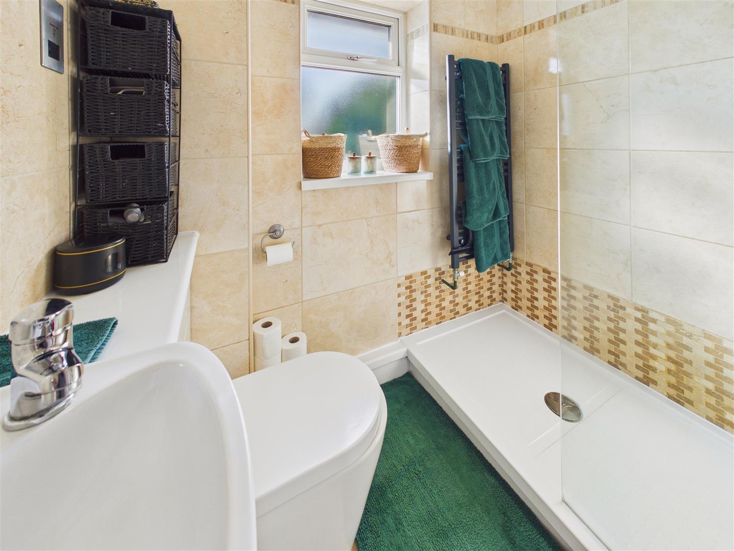 Shower Room - Tiled walls throughout, comprising a walk-in shower, low flush W.C. and wash-hand basin atop fitted vanity unit and window to the rear elevation.