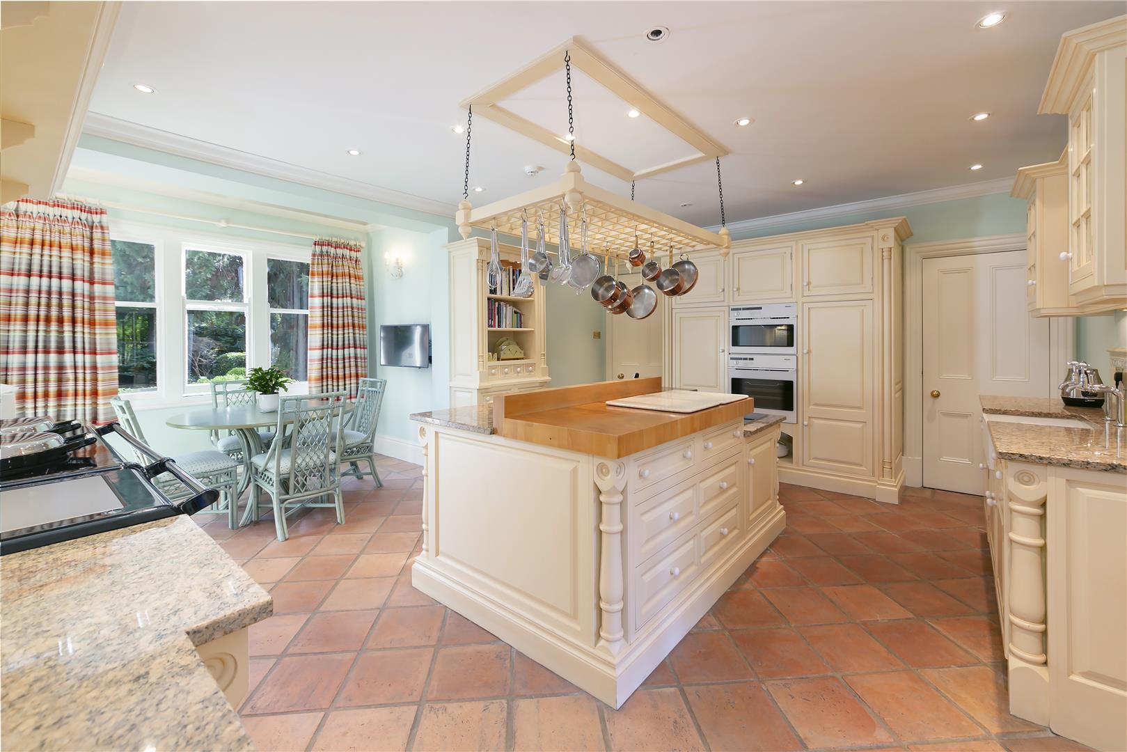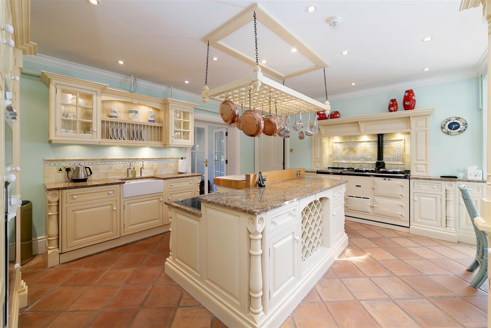 Kitchen - 6.05m x 5.18m approx (19'10 x 17'0 approx) - Having a range of bespoke classic style units with granite work surfaces and matching central island. Appliances include an integrated Miele double oven, four ring hob, dishwasher and fridge. The focal point of the room being the AGA. Quarry tiled flooring extends to throughout and a window in the breakfast area provides a view to the front. A door provides access to an under stairs area which is shelved and a pantry.