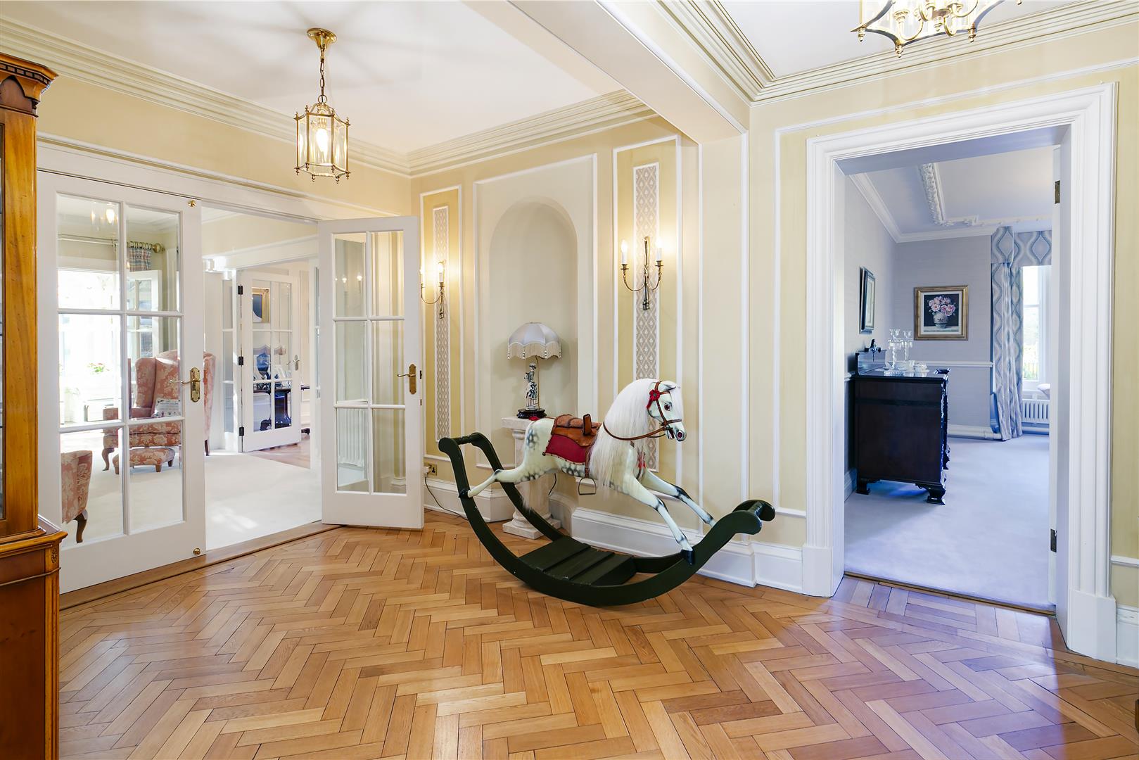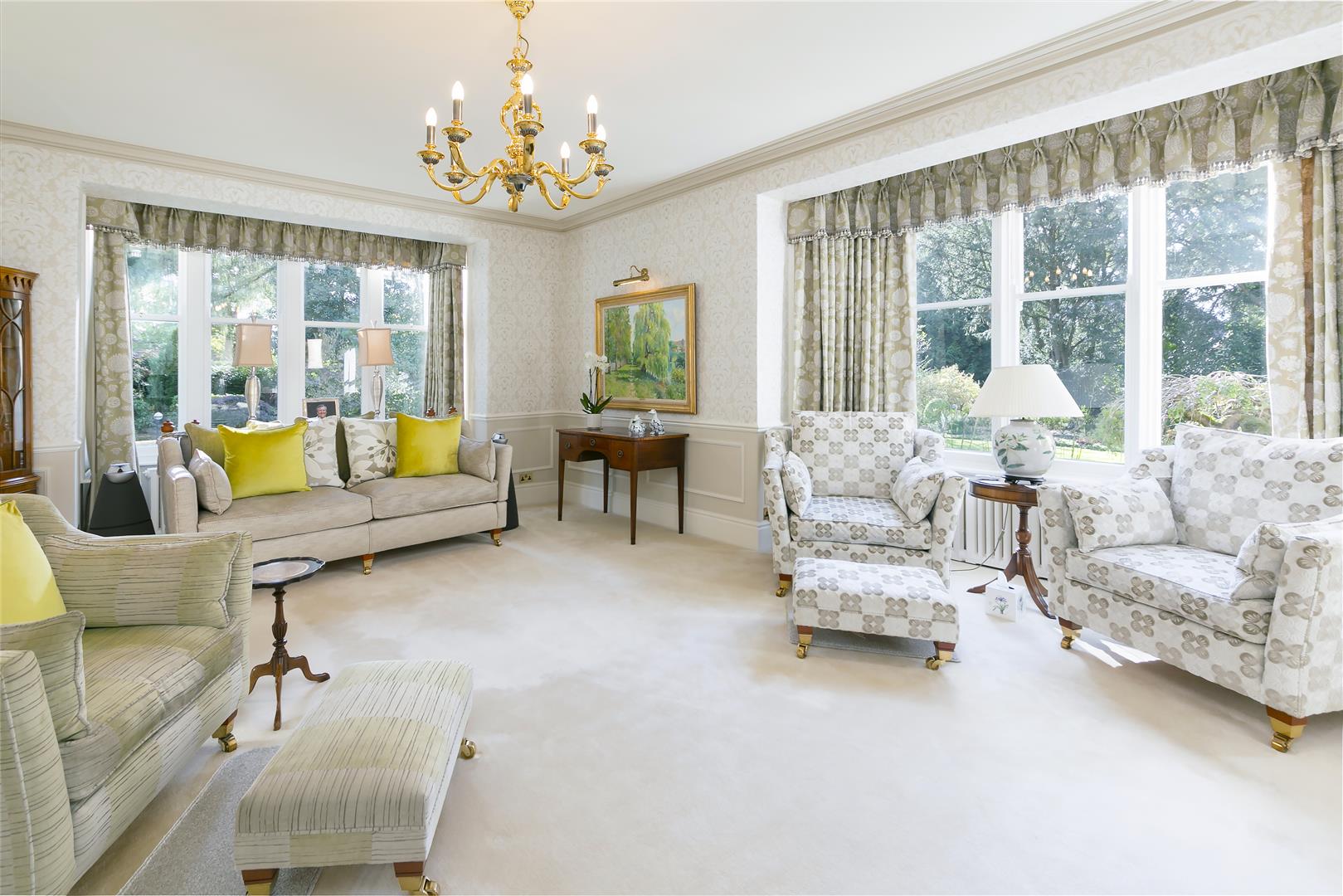 A simply stunning room with deep bay windows looking to the west and north elevations across the gardens together with double doors opening out to the terrace. Herringbone oak flooring extends throughout and beautiful coving is complemented by a ceiling rose. To one corner lies an angled grand fireplace housing a carved fire surround with inset Yorkshire Rose and cast and tiled open fire surround. Double doors connect into the sitting room.