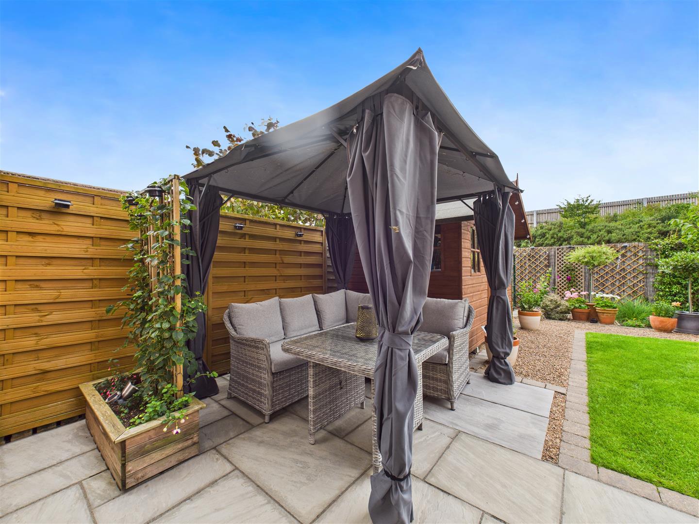 Outside - Outside, the delightful rear garden provides an ideal space for relaxation and enjoyment, complete with a patio area and gazebo, a lush lawn, and attractive planted borders, plus a large shed and greenhouse. Practical elements include parking for two vehicles to the front and an integral garage with an up and over door, currently configured as a gym with ample storage, offering both convenience and adaptability.