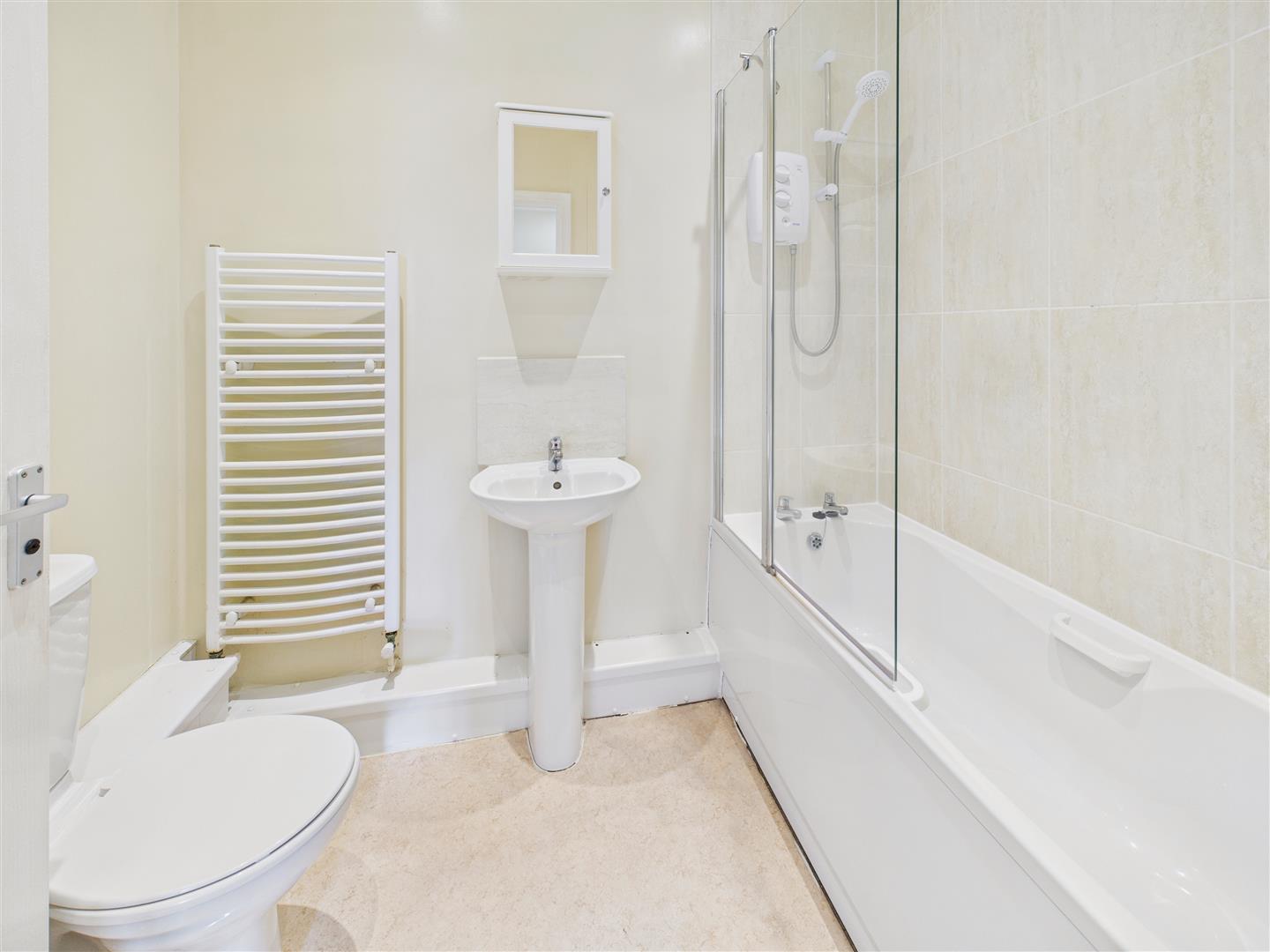 Bathroom - Comprising bath with shower screen and fitting, low-flush W.C. and wash-hand basin. The bath benefits from a tiled surround.