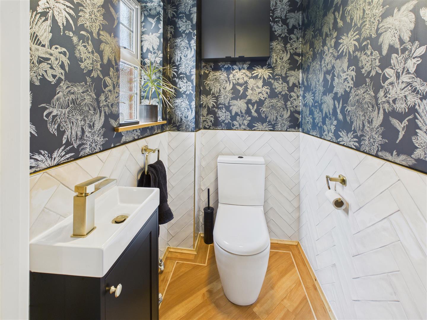 Cloaks/W.C. - With low flush W.C., wash hand basin in cabinet, tiled surround, Karndean flooring and window to side elevation.