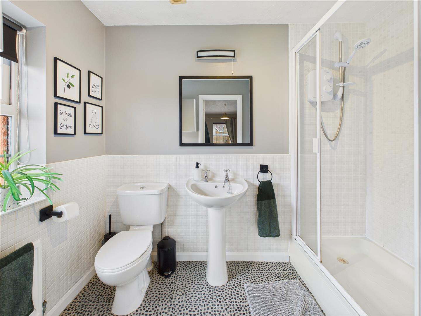 En-Suite Shower Room - With suite comprising a large shower enclosure, pedestal wash hand basin, low flush W.C., tiled surround and window to side elevation.