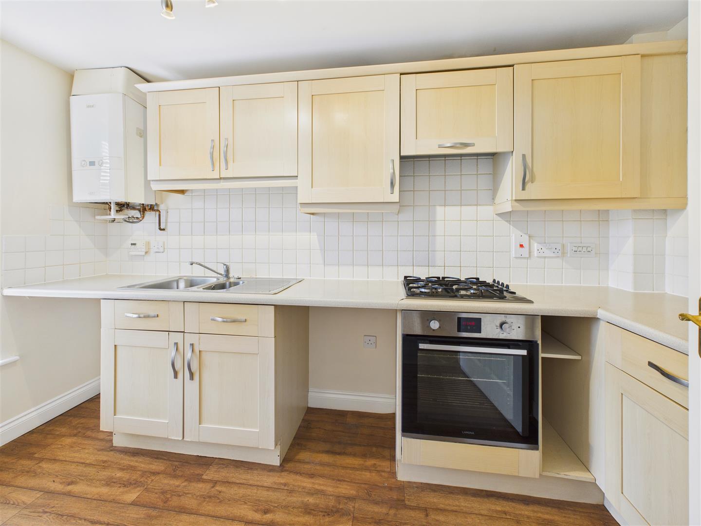 Kitchen - Having a range of fitted base and wall mounted units with roll top work surfaces. There is an integrated oven, four ring gas hob, filter hood above, one and a half sink and drainer unit, tiled surround. Space for appliances. Wall mounted Ideal gas fired central heating boiler. Window to front elevation.