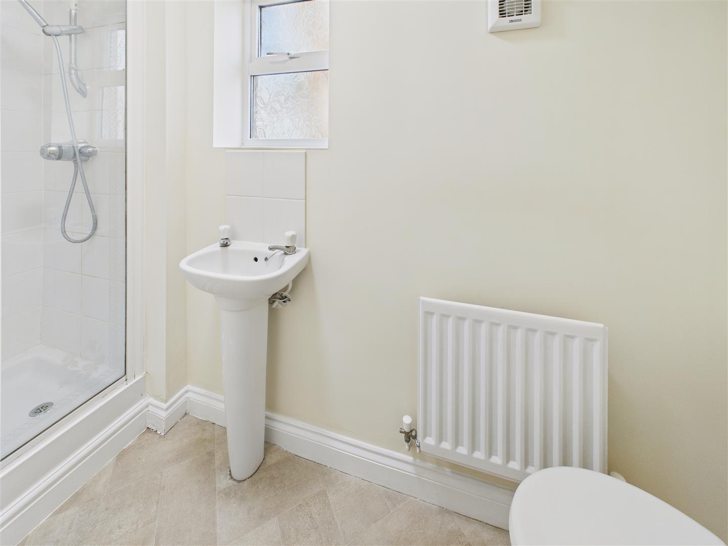 Shower Room - Comprising low-flush W.C., step-in shower enclosure with tiled surround and wash-hand basin beneath window to side.