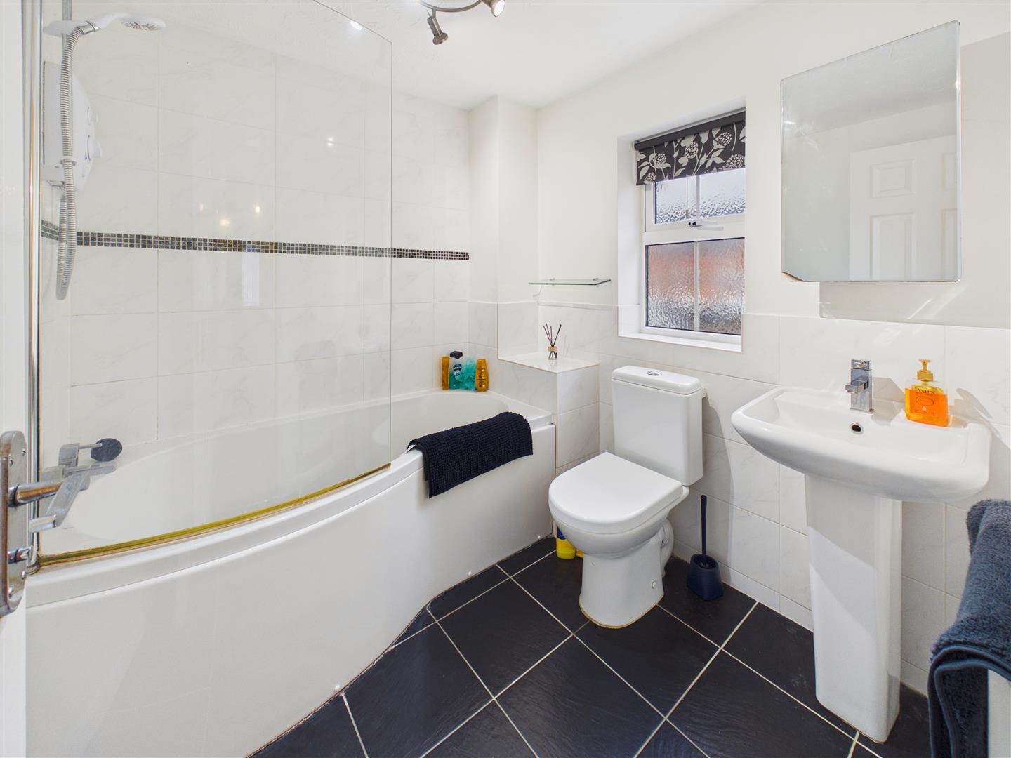 Bathroom - Half-tiled bathroom comprising bath with shower screen and fitting, wash-hand basin and low-flush W.C. beneath window to the front elevation.