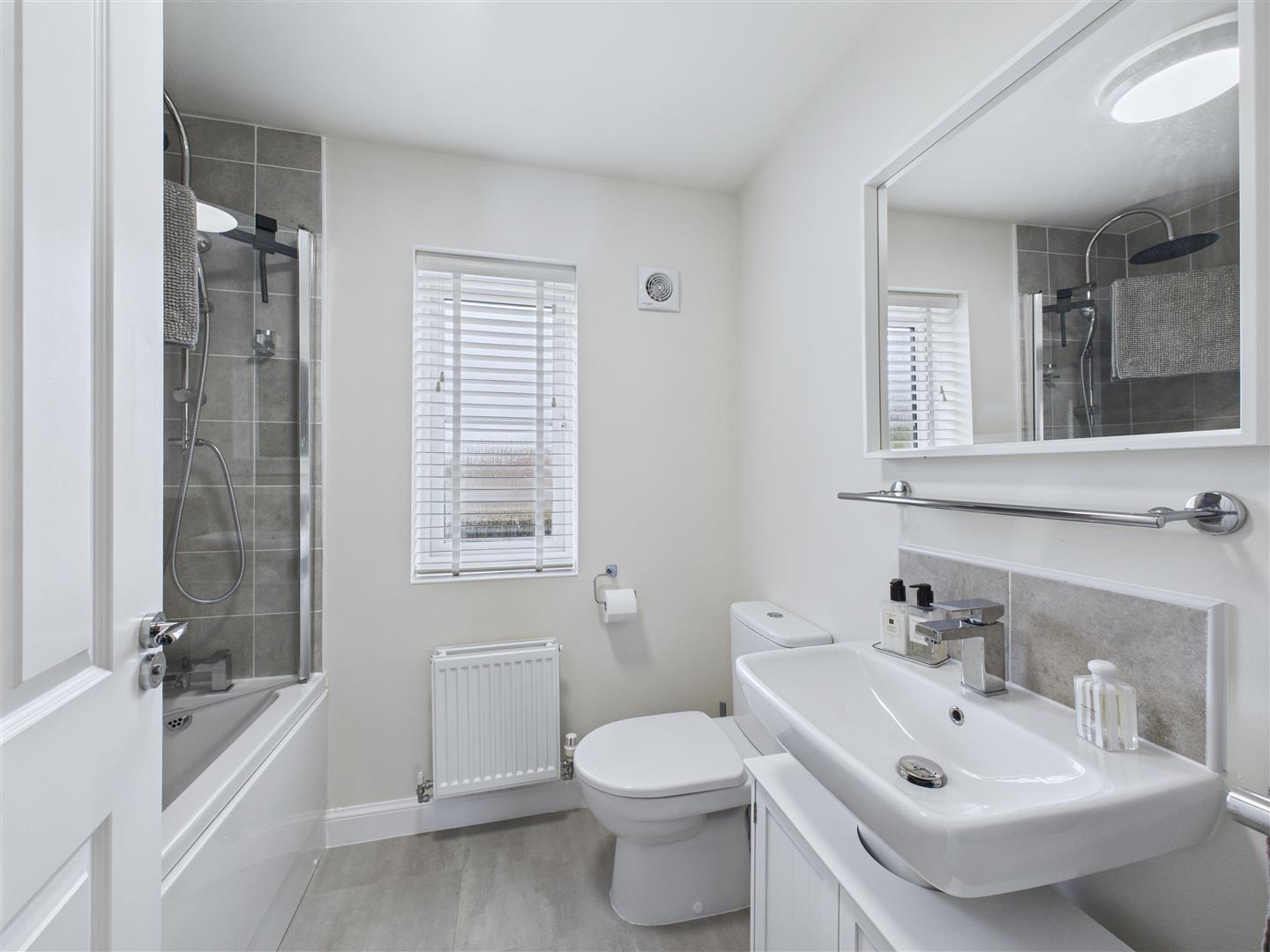 Bathroom - With suite comprising a bath with shower over featuring rainhead and handheld shower system and screen, wash hand basin and low flush W.C. Window to rear.