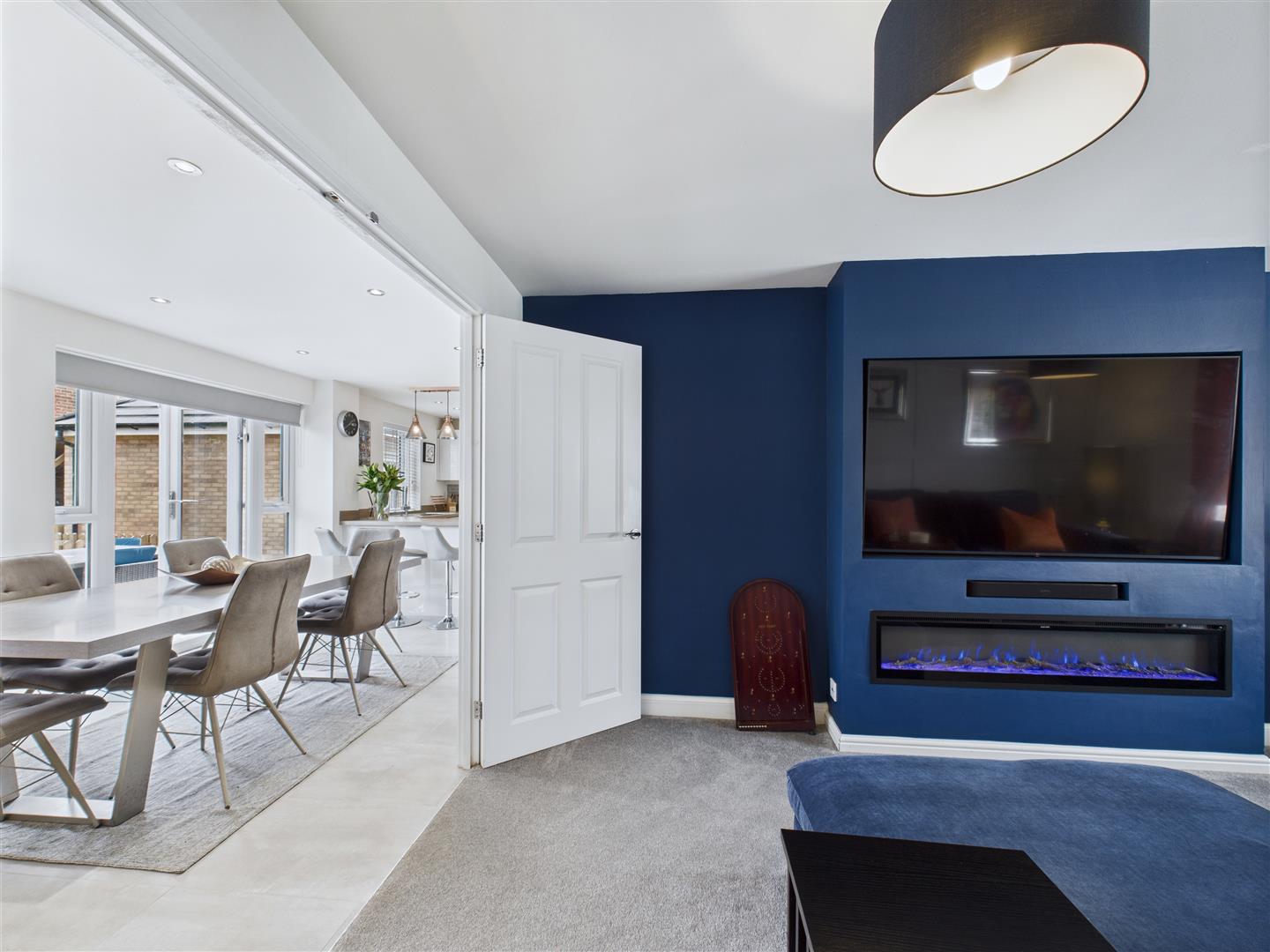 Lounge - Featuring a media wall with built in 60" remote control electric fire with different LED colour options. The 75" inset TV may be available by separate negotiation. Window to the front elevation and French doors connect through to the kitchen.